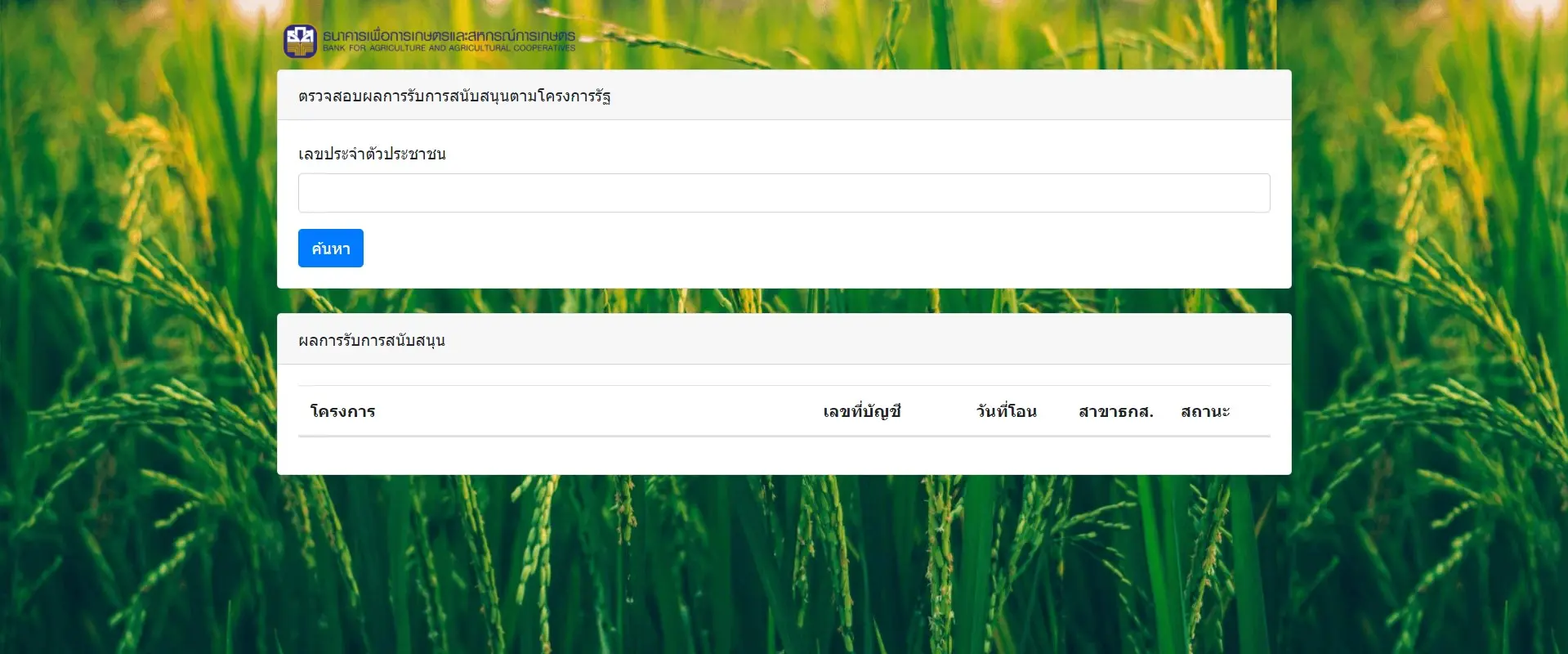 สำหรับผู้ที่ได้รับเงินระบบจะขึ้นข้อมูลว่า “โอนเงินเรียบร้อยแล้ว” โดยจะแสดงชื่อโครงการ, เลขที่บัญชี, วันที่โอน, สาขา ธ.ก.ส. และสถานะ