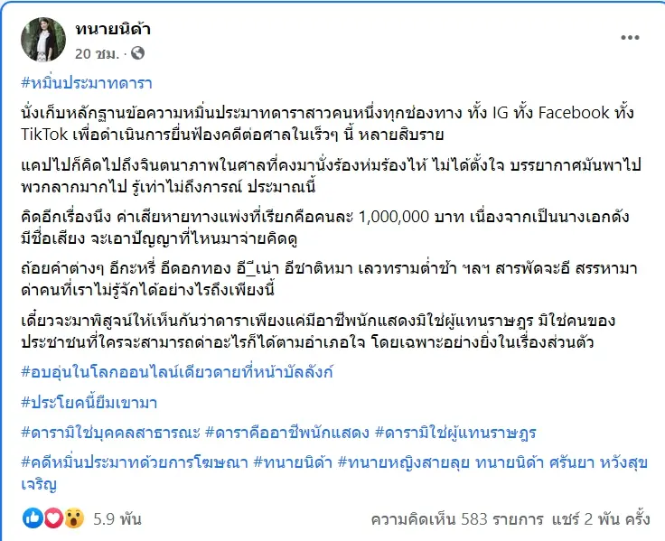 ทนายนิด้า หรือ นางสาวศรันยา หวังสุขเจริญ ทนายความสาว ออกมาโพสต์ข้อความผ่านเฟซบุ๊กแฟนเพจส่วนตัว กล่าวถึงเรื่องราวของเหล่าเกรียนคีย์บอร์ด ที่ได้เข้าไปคอมเมนต์ต่อว่าหรือหมิ่นประมาทนางเอกดัง รายหนึ่ง พร้อมเรียกค่าเสียหายรายละ 1 ล้าน โดยระบุว่า