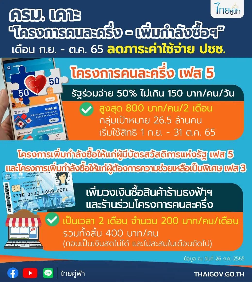 ความเคลื่อนไหว คณะรัฐมนตรี (ครม.) อนุมัติโครงการ คนละครึ่งเฟส 5 เพื่อลดภาระค่าครองชีพประชาชนจำนวน 26.5 ล้านคน ภายใต้กรอบวงเงินกว่า 21,200 ล้านบาท นั้น