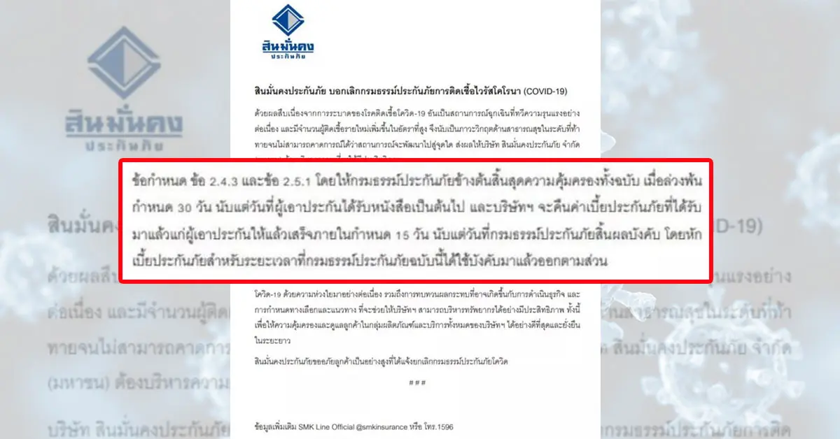 เช็กด่วน!!! สินมั่นคง ประกันภัย ประกาศยกเลิก ประกันโควิด “เจอ จ่าย จบ” หรือ COVID 2 in 1 ผู้ถือกรมกรมธรรม์ รับเงินคืนใน 15 วัน