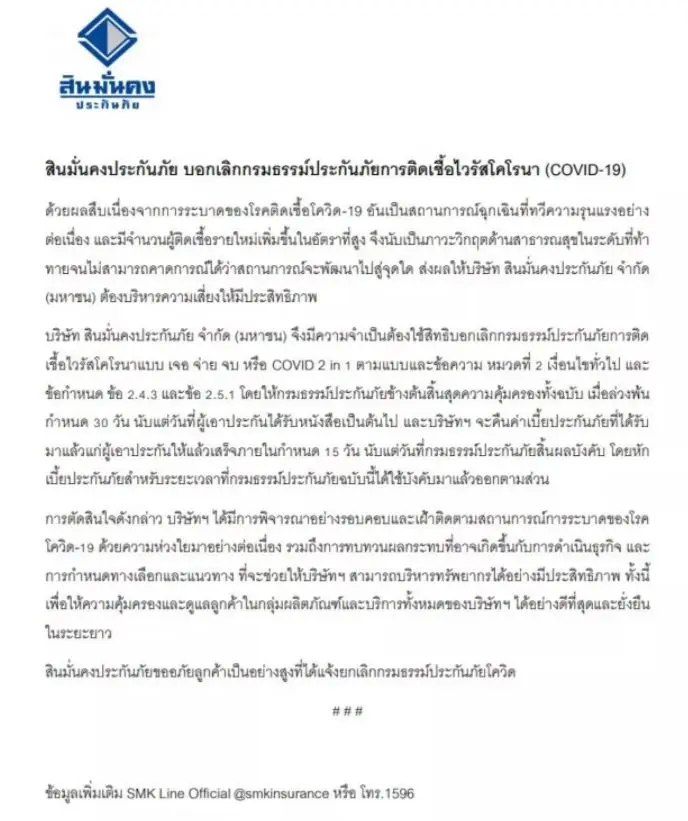 การตัดสินใจดังกล่าว บริษัท ฯ ได้มีการพิจารณาอย่างรอบคอบและเฝ้าติดตามสถานการณ์การระบาดของโรคโควิด -19 ด้วยความห่วงใยมาอย่างต่อเนื่องรวมถึงการทบทวนผลกระทบที่อาจเกิดขึ้นกับการดำเนินธุรกิจและการกำหนดทางเลือกและแนวทางที่จะช่วยให้ บริษัท ฯ สามารถบริหารทรัพยากรได้อย่างมีประสิทธิภาพทั้งนี้เพื่อให้ความคุ้มครองและดูแลลูกค้าในกลุ่มผลิตภัณฑ์และบริการทั้งหมดของ บริษัท ฯ ได้อย่างดีที่สุดและยั่งยืนในระยะยาวสินมั่นคงประกันภัยขออภัยลูกค้าเป็นอย่างสูงที่ได้แจ้งยกเลิกกรมธรรม์ประกันภัยโควิด
