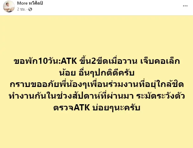 โดยได้มีการโพสต์ข้อความผ่านเฟซบุ๊ก More ทวีศิลป์ เมื่อวันที่ 28 พ.ค.65 ระบุว่า ขอพัก 10 วัน หลังจากตรวจ ATK ขึ้น 2 ขีดเมื่อวาน เจ็บคอเล็กน้อย อื่นๆปกติดี