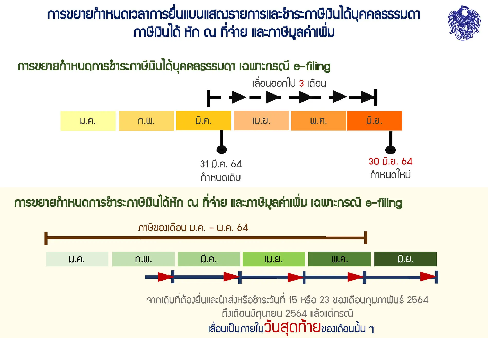 3.1 ขยายเวลาการยื่นและชาระภาษีเงินได้บุคคลธรรมดา 3 เดือน จากเดิมภายในวันที่ 31 มีนาคม 2564 เป็น 30 มิถุนายน 2564 เฉพาะการยื่นแบบ e-filing
