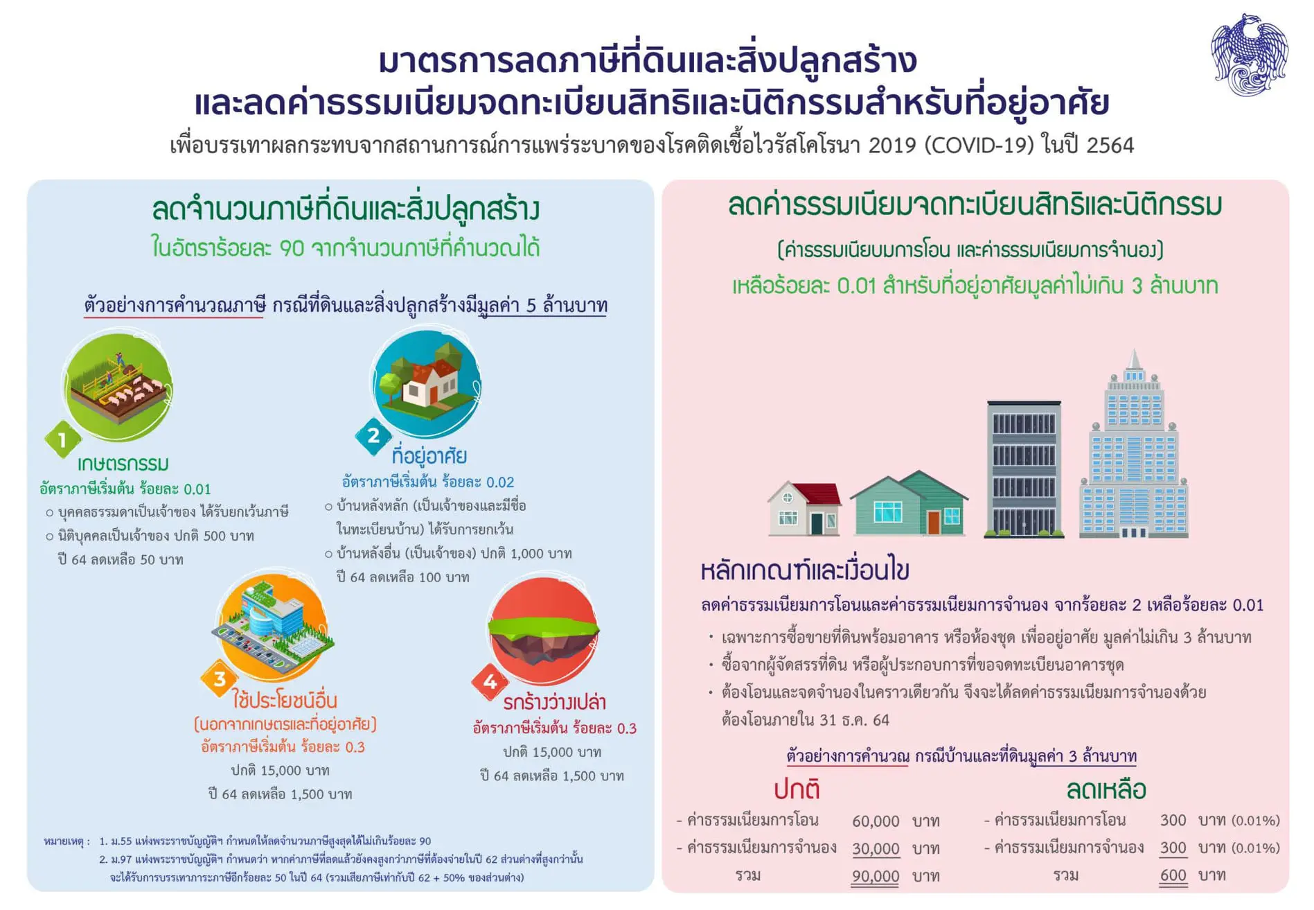 - มาตรการลดค่าธรรมเนียมจดทะเบียนสิทธิและนิติกรรมสาหรับที่อยู่อาศัย (มาตรการลดค่าธรรมเนียมฯ) มีวัตถุประสงค์เพื่อสนับสนุนและบรรเทาภาระให้แก่ประชาชนที่ต้องการซื้อที่อยู่อาศัยใหม่เป็นของตนเอง รวมถึง ช่วยรักษาระดับกิจกรรมทางเศรษฐกิจในภาคอสังหาริมทรัพย์ซึ่งเชื่อมโยงกับการจ้างงานและธุรกิจที่เกี่ยวเนื่องกับ ภาคอสังหาริมทรัพย์ในสถานการณ์การแพร่ระบาดของ COVID–19 โดยลดค่าธรรมเนียมการโอนจากร้อยละ 2 ลงเหลือร้อยละ 0.01 และลดค่าธรรมเนียมการจานองจากร้อยละ 1 ลงเหลือร้อยละ 0.01 (เฉพาะการโอนและ จดจานองในคราวเดียวกัน) สาหรับที่อยู่อาศัยใหม่ ราคาไม่เกิน 3 ล้านบาทต่อหน่วย