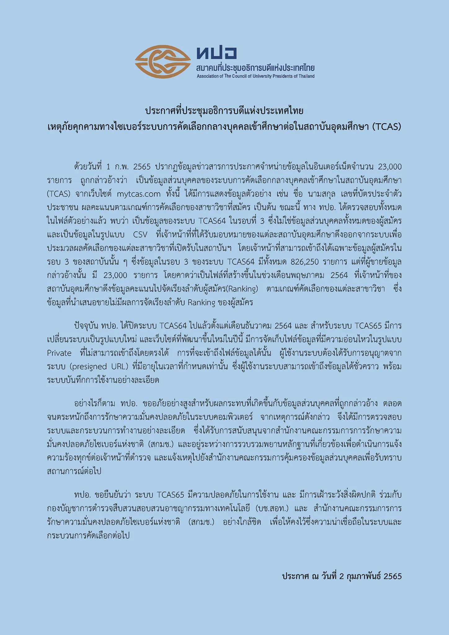 โดยทิ้งท้ายเอาไว้ว่า ทปอ. ขอยืนยันว่า ระบบ TCAS65 มีความปลอดภัยในการใช้งาน และ มีการเฝ้าระวังสิ่งผิดปกติ ร่วมกับกองบัญชาการตำรวจสืบสวนสอบสวนอาชญากรรมทางเทคโนโลยี (บช.สอท.) และ สำนักงานคณะกรรมการการรักษาความมั่นคงปลอดภัยไซเบอร์แห่งชาติ (สกมช.) อย่างใกล้ชิด เพื่อให้คงไว้ซึ่งความน่าเชื่อถือในระบบและกระบวนการคัดเลือกต่อไป