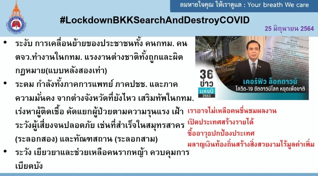 ระวัง จัดเตรียมมาตรการเยียวยาและช่วยเหลือผู้ได้รับผลกระทบอย่างเต็มที่ ตรงเป้าที่คนรากหญ้า และต้องไม่ให้ถูกเบียดบังโดยกลุ่มคนฉ้อฉล เราอาจไม่มีคนที่แข็งแรงพอที่จะชื่นชมผลงานการเปิดประเทศสร้างรายได้ ซื้ออาวุธเพื่อปกป้องประเทศ หรือสร้างสิ่งประดับสวยงามในท้องถิ่นแบบผลาญเงินและไม่เกิดมูลค่าเพิ่มและต้องทำมาตรการเช่นเดียวกันนี้ในทุกจังหวัดที่มีปัญหาเช่นเดียวกับกทม.