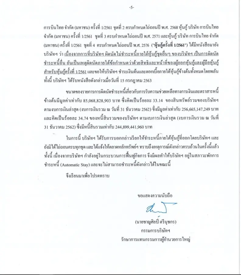 ทั้งนี้ บริษัทได้รับการบอกกล่าวเรียกให้ชำระหนี้ภายใต้หุ้นกู้ที่ออกโดยบริษัทและยังมิได้ไถ่ถอนครบทุกชุด และเนื่องจากบริษัทกำลังอยู่ในกระบวนการฟื้นฟูกิจการ ทำให้อยู่ในสภาวะพักการชำระหนี้(Automatic Stay) และไม่สามารถชำระหนี้ดังกล่าวได้ในขณะนี้
