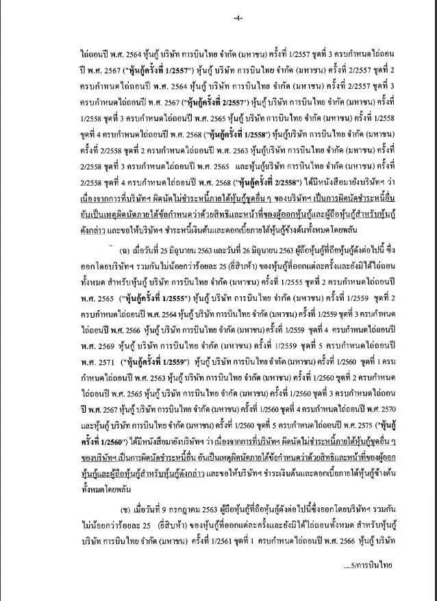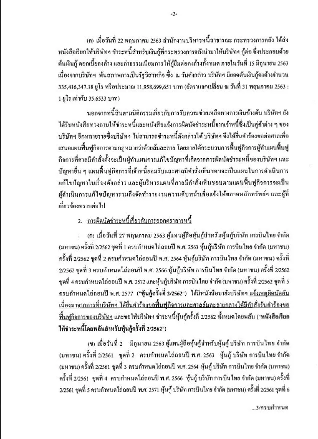 สำหรับการผิดนัดชำระหนี้เกี่ยวกับการรับความช่วยเหลือทางการเงิน ประกอบด้วย ธนาคารซีไอเอ็มบีไทย จำกัด(มหาชน) จำนวน 1,001,526,512.57 บาท, ธนาคารอิสลามแห่งประเทศไทย จำนวน 500,602,739.73 บาท, สำนักงานบริหารหนี้สาธารณะ กระทรวงการคลัง จำนวน 11,958,699,651 บาท ส่วนการผิดชำระหนี้เกี่ยวกับการออกตราสารหนี้ ประกอบด้วย หุ้นกู้ซึ่งผู้แทนผู้ถือหุ้นกู้มีหนังถือแจ้งให้บริษัทชำระหนี้หุ้นกู้ทั้งหมดโดยพลันเมื่อวันที่ 27 พฤษภาคม 2563 จำนวน 5 ชุด มูลค่ารวม 8,788 ล้านบาท, หุ้นกู้ซึ่งผู้แทนผู้ถือหุ้นกู้มีหนังถือแจ้งให้บริษัทชำระหนี้หุ้นกู้ทั้งหมดโดยพลันเมื่อวันที่ 2 มิถุนายน 2563 จำนวน 12 ชุด มูลค่ารวม15,500 ล้านบาท, หุ้นกู้ซึ่งผู้แทนผู้ถือหุ้นกู้มีหนังถือแจ้งให้บริษัทชำระหนี้หุ้นกู้ทั้งหมดโดยพลันเมื่อวันที่ 12 มิถุนายน 2563 จำนวน 2 ชุด มูลค่ารวม 3,000 ล้านบาท