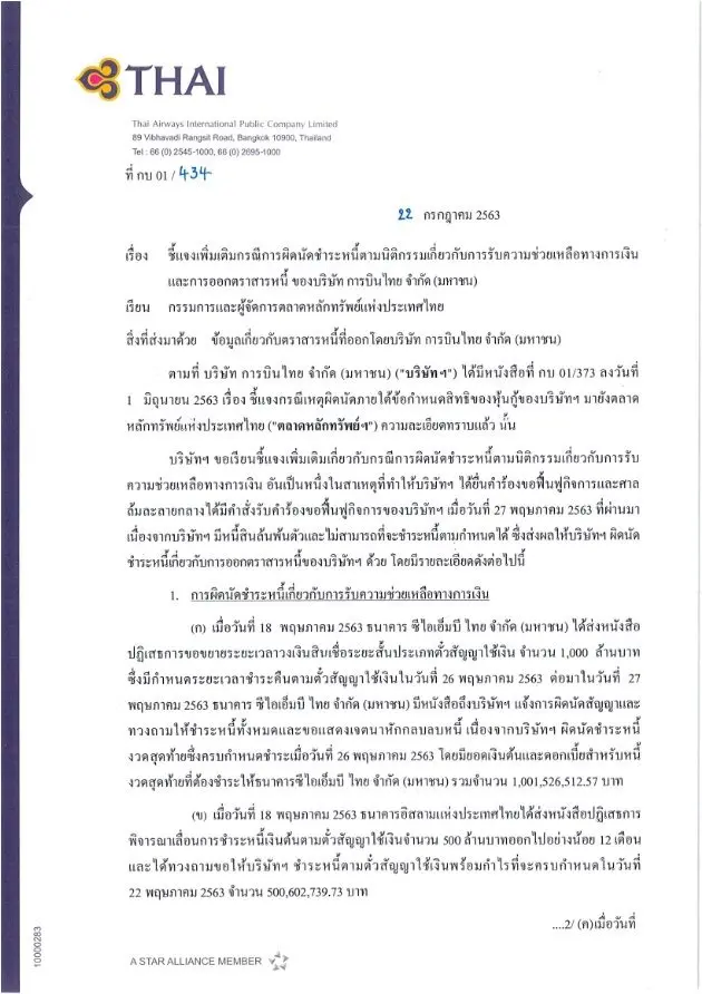 นายชาญศิลป์ ตรีนุชกร กรรมการบริษัท รักษาการแทนกรรมการผู้อำนวยการใหญ่ บริษัท การบินไทย จำกัด (มหาชน) (THAI) ได้ทำหนังสือแจ้งต่อตลาดหลักทรัพย์แห่งประเทศไทย (ตลท.) กรณีการผิดชำระหนี้ตามนิติกรรมเกี่ยวกับการรับความช่วยเหลือทางการเงิน และการออกตราสารหนี้ มูลค่ารวม 85,068,828,903 บาท หรือ 33.14% ของสินทรัพย์รวมของบริษัท ตามงบการเงินล่าสุด ณ วันที่ 31 ธันวาคม 2562 ซึ่งมีมูลค่ารวม 256,665,147,249 บาท และคิดเป็น 34.74% ของหนี้สินรวมของบริษัทที่อยู่ที่ 244,899,441,960 บาท