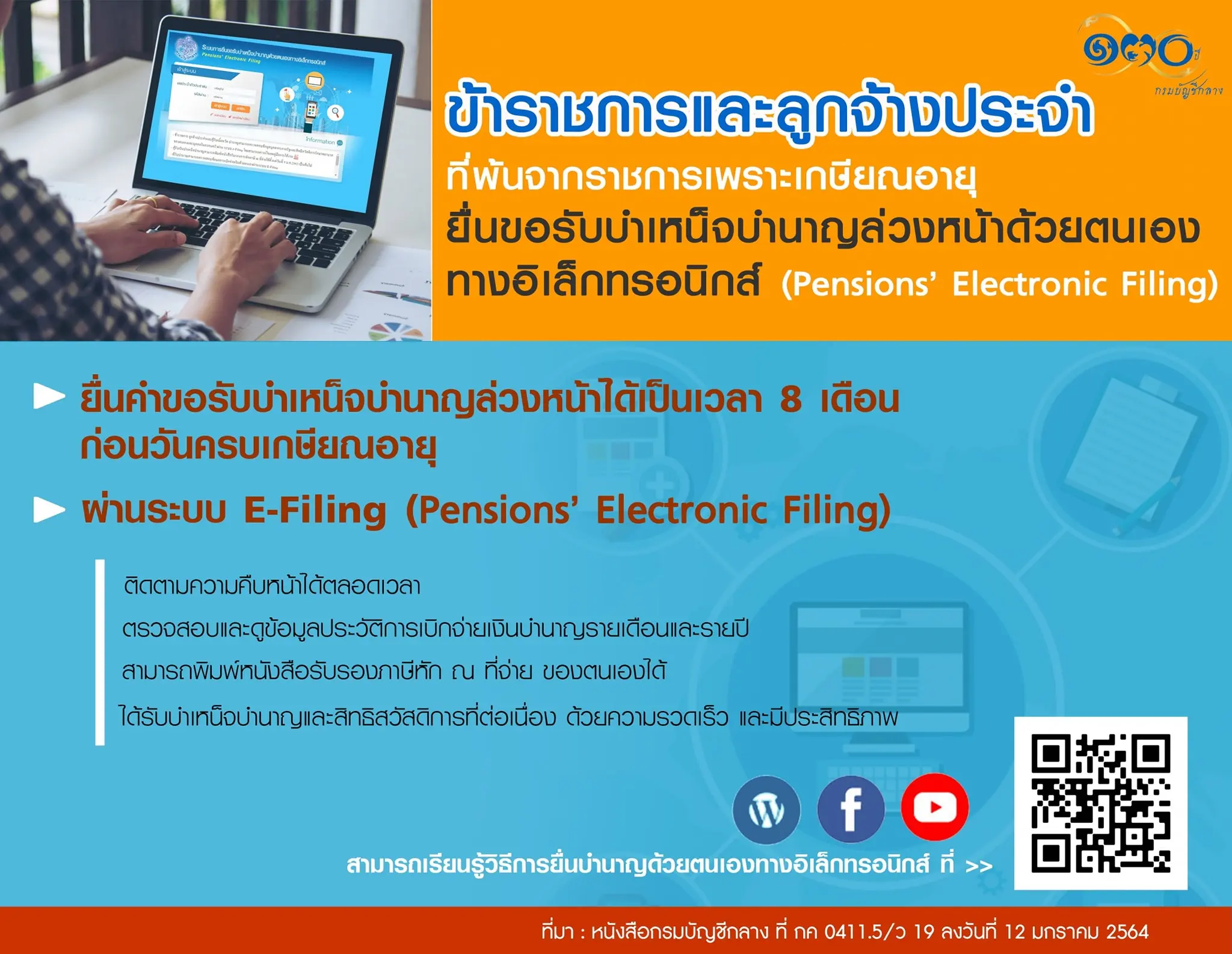 “เมื่อข้าราชการและลูกจ้างประจำที่พ้นจากราชการเพราะเกษียณอายุ ได้ยื่นคำขอรับบำเหน็จบำนาญล่วงหน้าเรียบร้อยแล้ว จะเริ่มได้รับบำเหน็จบำนาญหลังจากเกษียณ ณ สิ้นเดือนตุลาคมเป็นต้นไป โดยผู้มีสิทธิขอรับบำเหน็จบำนาญ สามารถเรียนรู้ขั้นตอนการยื่นขอรับบำเหน็จบำนาญด้วยตนเองผ่านระบบ e-filing ได้ที่เว็บไซต์กรมบัญชีกลาง (www.cgd.go.th) YouTube Channel (กรมบัญชีกลาง กระทรวงการคลัง) หรือ Facebook (กรมบัญชีกลาง The Comptroller General’s Department) หากมีข้อสงสัยประการใด สามารถติดต่อสอบถามรายละเอียดได้ที่ Call center กรมบัญชีกลาง 02 270 6400 ในวัน เวลาราชการ”