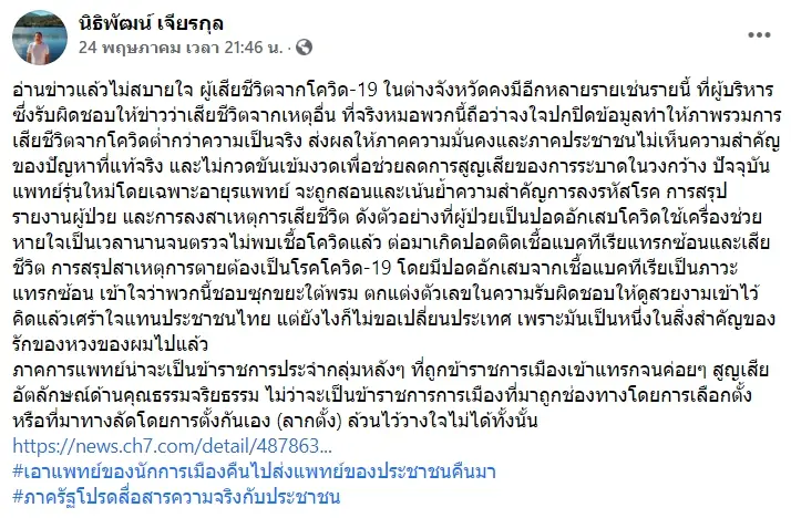 หมอนิธิพัฒน์ เผย ความจริงโควิดที่ถูกปิด จำนวนผู้เสียชีวิตจากโควิดที่ไม่ถูกนับเพิ่ม เนื่องจากสาเหตุการเสียชีวิตที่ถูกเปลี่ยนแปลง