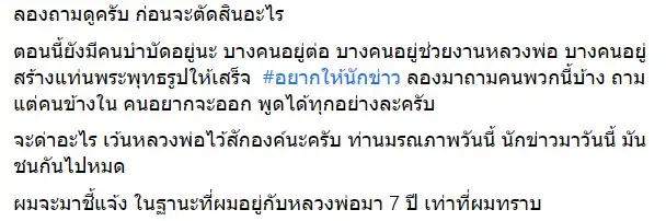 จะด่าอะไร เว้นหลวงพ่อไว้สักองค์นะครับ ท่านมรณภาพวันนี้ นักข่าวมาวันนี้ มันชนกันไปหมด ผมจะมาชี้แจ้ง ในฐานะที่ผมอยู่กับหลวงพ่อมา 7 ปี เท่าที่ผมทราบ”