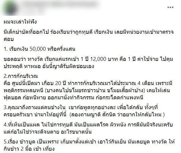 ล่าสุดได้มีผู้ใช้เฟซบุ๊กรายหนึ่งออกมาโพสต์แก้ต่างให้ทางวัด โดยระบุว่า “ผมจะเล่าให้ฟัง มีเด็กบำบัดที่ออกไป ร้องเรียนว่าถูกทุบตี เรียกเงิน เลยมีหน่วยงานเข้ามาตรวจสอบ