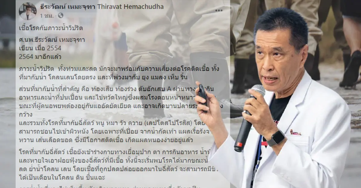 จากสถานการณ์น้ำท่วมสูงในหลายพื้นที่ “หมอธีระวัฒน์” โพสต์ห่วงเชื้อโรคกับภาวะน้ำวิปริต ในช่วงน้ำท่วมนี้ ระวัง! ท้องเสีย ตับอักเสบ และฉี่หนู
