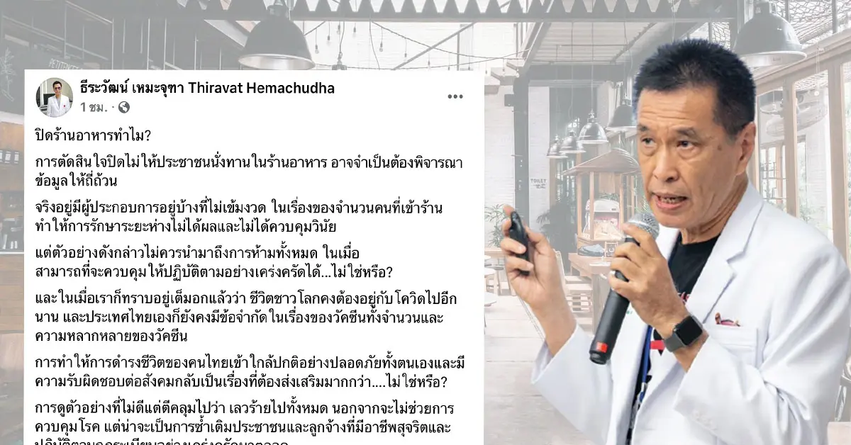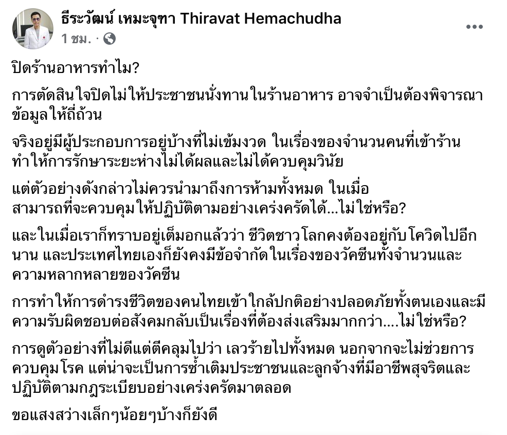 หลังจากการประกาศห้ามนั่งรับประทานอาหารภายในร้าน สืบเนื่องมาจากสถานการณ์การแพร่ระบาดของเชื้อโควิด-19 ซึ่งเริ่มบังคับใช้ในวันที่ 28 มิถุนายน 2564 ทำให้หลายผู้ประกอบการได้รับผลกระทบจากเรื่องนี้ ล่าสุดวันนี้ นพ.ธีระวัฒน์ เหมะจุฑา หัวหน้าศูนย์วิทยาศาสตร์สุขภาพโรคอุบัติใหม่ คณะแพทยศาสตร์ โรงพยาบาลจุฬาลงกรณ์ ได้โพสต์ข้อความลงบนเฟศบุ๊กส่วนตัว ในประเด็น ” ปิดร้านอาหารทำไม? “