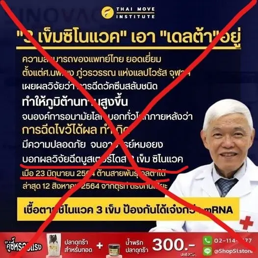 หมอยง โพสต์เฟซบุ๊กโต้ข่าวปลอม ยัน ไม่เคยพูดเรื่องซิโนแวค 3 เข็ม ลั่นไม่เคยทำการศึกษา มีแต่การศึกษาว่าการให้เชื้อตาย 2 เข็มแล้วตามด้วยไวรัสเวกเตอร์
