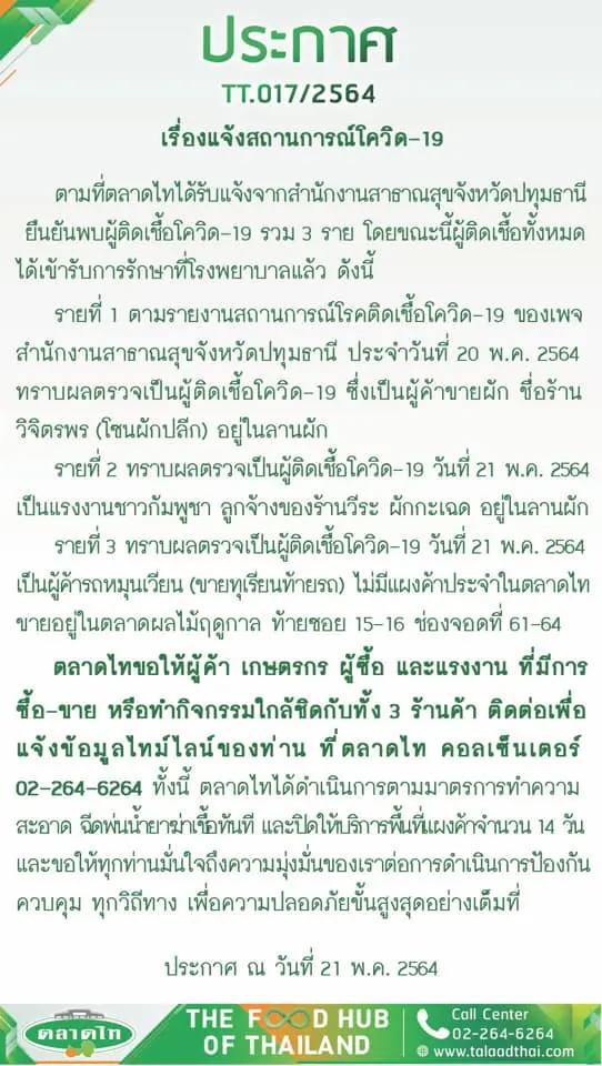ทั้งนี้ ในกรณีการพบผู้ติดเชื้อโควิด-19 ที่ตลาดไท ทั้งหมด 3 ราย ทางตลาดไท ได้ทำการปิดแผงขายทั้ง 3 แผงที่เกี่ยวข้องกับผู้ติดเชื้อ เป็นเวลา 14 วัน พร้อมทั้งทำความสะอาด และพ้นนำ้ยาฆ่าเชื้อ ตามมาตรการของตลาดไท และ ศบค. ส่วนผู้ติดเชื้อทั้ง 3 ราย ได้เข้ารับการรักษาเป็นที่เรียบร้อยแล้ว