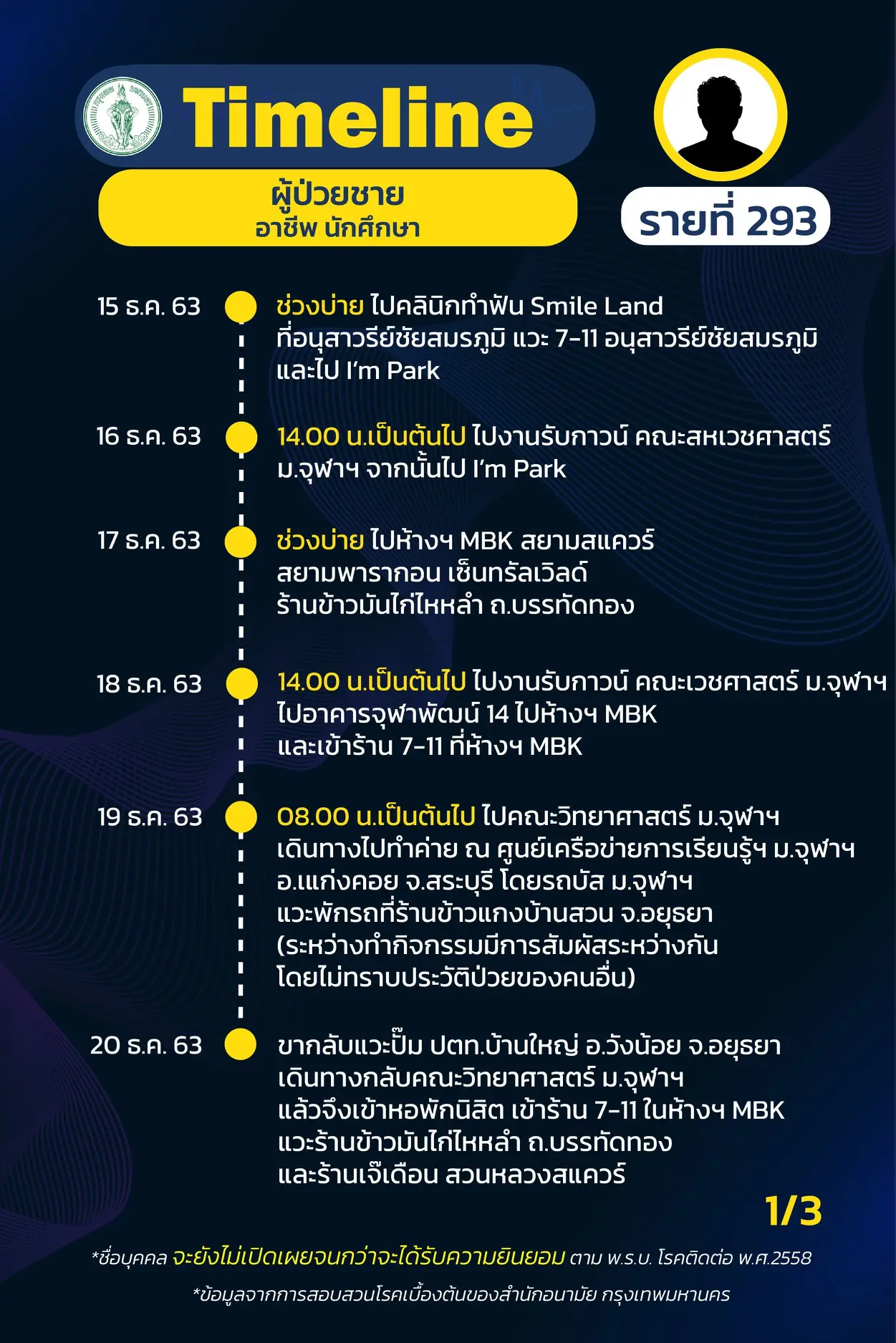 อย่างไรก็ตามพบว่า ผู้ป่วยรายที่ 293 พบนักศึกษาชาย มีประวัติการเดินทางหลายแห่ง ในกรุงเทพฯ อาทิ คลินิกทำฟัน , ม.จุฬาฯ , ห้างสรรพสินค้า MBK , สยามสแควร์ , สยามพารากอน และ เซ็นทรัลเวิลด์ เป็นต้น
