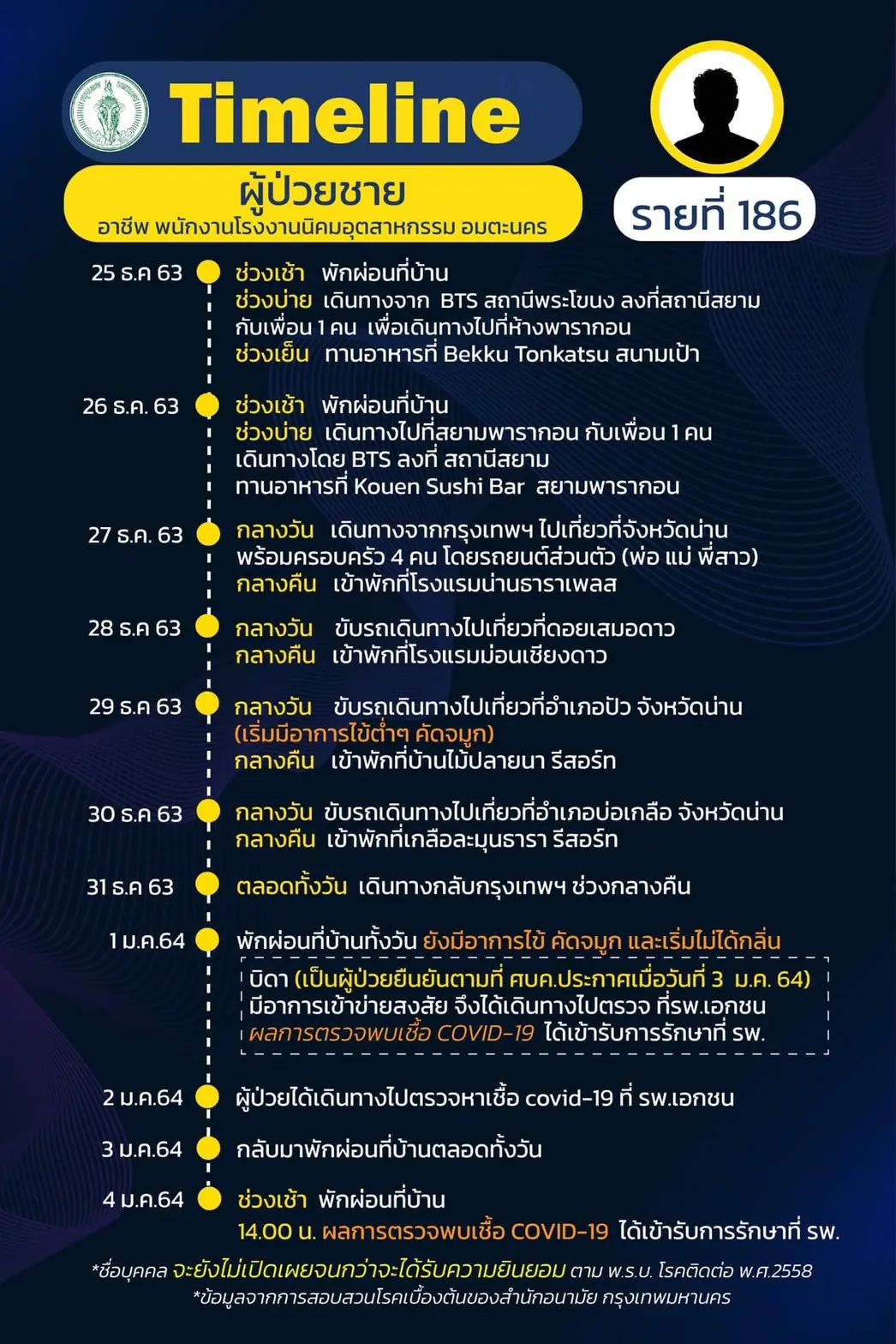 ทั้งนี้ มีเคสที่น่าสนใจคือ รายที่ 186 หนุ่มอาชีพพนักงานโรงงานอุตสาหกรรม ที่ทั้งขึ้นรถไฟฟ้า BTS เดินเที่ยวห้างพารากอน ทานอาหารในร้าน Bekku Tonkatsu และ Kouen Sushi Bar รวมถึงเที่ยวจังหวัดน่านกับครอบครัว เข้าพักใน 4 โรงแรม ซึ่งมีโอกาสที่จะแพร่