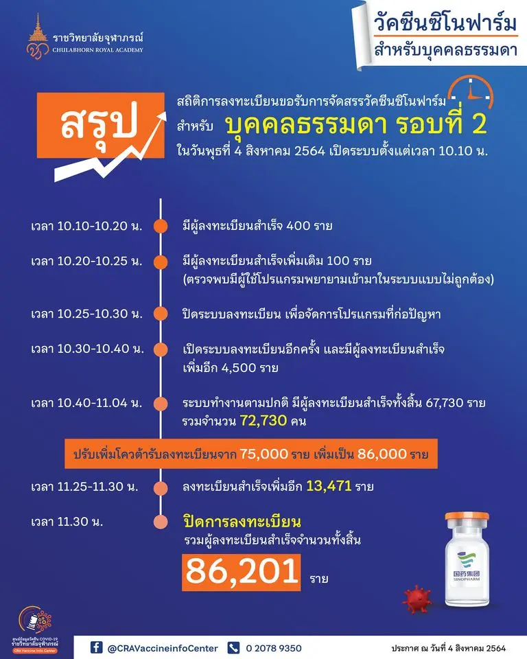 ล่าสุด ทางเพจเฟซบุ๊ก ศูนย์ข้อมูลราชวิทยาลัยจุฬาภรณ์ ได้เปิดเผยไทม์ไลน์สรุปผลการลงทะเบียนเข้ารับวัคซีนซิโนฟาร์ม สำหรับบุคคลธรรมดารอบที่ 2 วันพุธที่ 4 สิงหาคม 2564 ตั้งแต่ 10.10 น. – 11.30 น. รวมยอดผู้ลงทะเบียนทั้งหมด 86,201 ราย และมีไทล์ไลน์การลงทะเบียนดังนี้