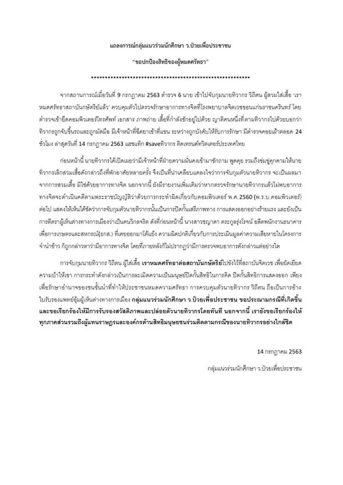 การจับกุมนายทิวากร วิถีตน ผู้ใส่เสื้อ เราหมดศรัทธาต่อสถาบันกษัตริย์ไปขังไว้ที่สถาบันจิตเวช เพื่อยัดเยียดความบ้าให้เขา การกระทำดังกล่าวเป็นการละเมิดความเป็นมนุษย์ปิดกั้นสิทธิในการคิด ปิดกั้นสิทธิการแสดงออก เพียงเพื่อรักษาอำนาจของชนชั้นนำที่ทำให้ประชาชนหมดความศรัทธา การควบคุมตัวนายทิวากร วิถีตน ถือเป็นการอ้างใบรับรองแพทย์อุ้มผู้เห็นต่างทางการเมือง กลุ่มแนวร่วมนักศึกษา ว.ป๋วยเพื่อประชาชน ขอประณามกรณีที่เกิดขึ้น และขอเรียกร้องให้มีการรับรองสวัสดิภาพและปล่อยตัวนายทิวากรโดยทันที นอกจากนี้ เรายังขอเรียกร้องให้ ทุกภาคส่วนรวมถึงผู้แทนราษฎรและองค์กรด้านสิทธิมนุษยชนร่วมติดตามกรณีของนายทิวากรอย่างใกล้ชิด
