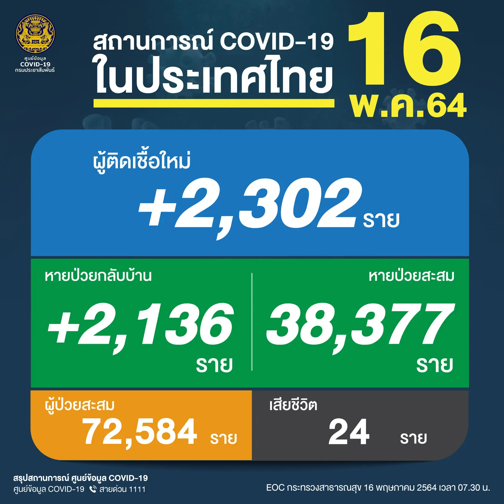 โควิดวันนี้ — เมื่อวันที่ 16 พฤษภาคม 2564 ศูนย์ข้อมูล COVID-19 รายงานยอดผู้ติดเชื้อ โควิด-19 โดยพบผู้ติดเชื้อรายใหม่เพิ่ม 2,302 ราย เสียชีวิต 24 ราย ทำให้การระบาดโควิด19 ระลอกใหม่ตั้งแต่เดือนเมษายน 2564 มียอดผู้เสียชีวิตสะสม 495 ราย ส่วนยอดผู้เสียชีวิตสะสมจากการแพร่ระบาดของโควิด19 ในเวลามีทั้งหมด 589 ราย สำหรับวันนี้ไม่มีรายงานผู้ติดเชื้อจากเรือนจำ