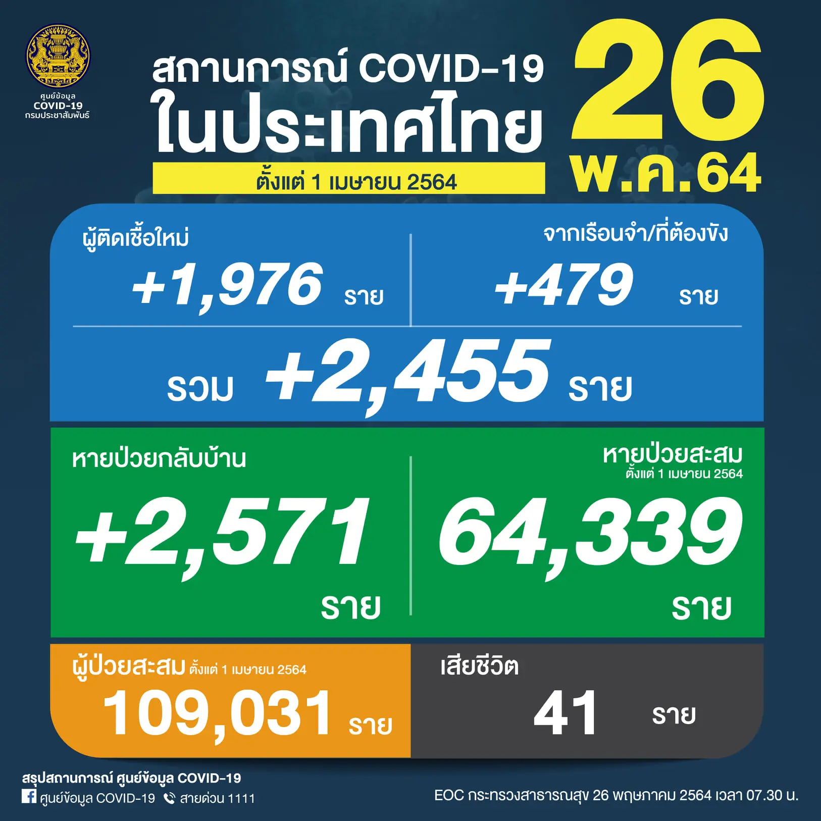 โควิดวันนี้ — เมื่อวันที่ 26 พฤษภาคม 2564 ศูนย์ข้อมูล COVID-19 รายงานยอดผู้ติดเชื้อ โควิด-19 โดยพบผู้ติดเชื้อรายใหม่เพิ่ม 1,976 ราย เสียชีวิต 41 ราย ทำให้การระบาดโควิด19 ระลอกใหม่ตั้งแต่เดือนเมษายน 2564 มียอดผู้เสียชีวิตสะสม 779 ราย ส่วนยอดผู้เสียชีวิตสะสมจากการแพร่ระบาดของโควิด19 ในเวลามีทั้งหมด 873 ราย สำหรับวันนี้มีรายงานผู้ติดเชื้อจากเรือนจำทั้งหมด 479 ราย รวมจำนวนผู้ติดเชื้อรายใหม่วันนี้ทั้งสิ้น 2,455 ราย