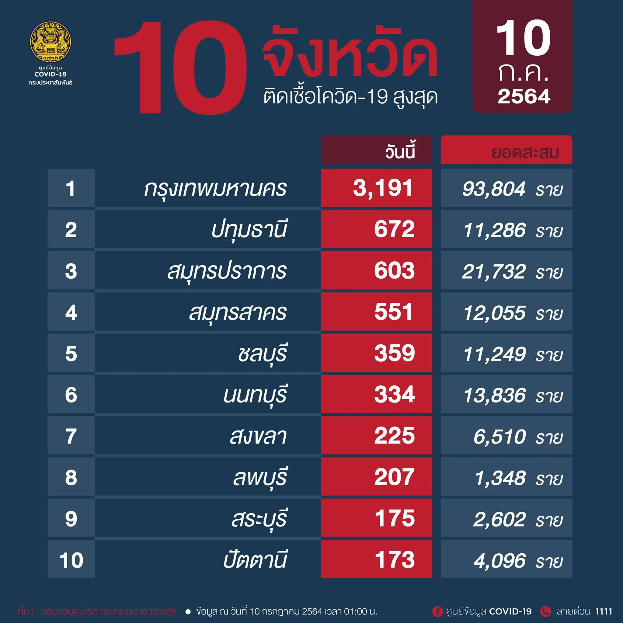 1.กรุงเทพมหานคร ติดเชื้อวันนี้ 3,191 ราย ติดเชื้อสะสม 93,804 ราย
