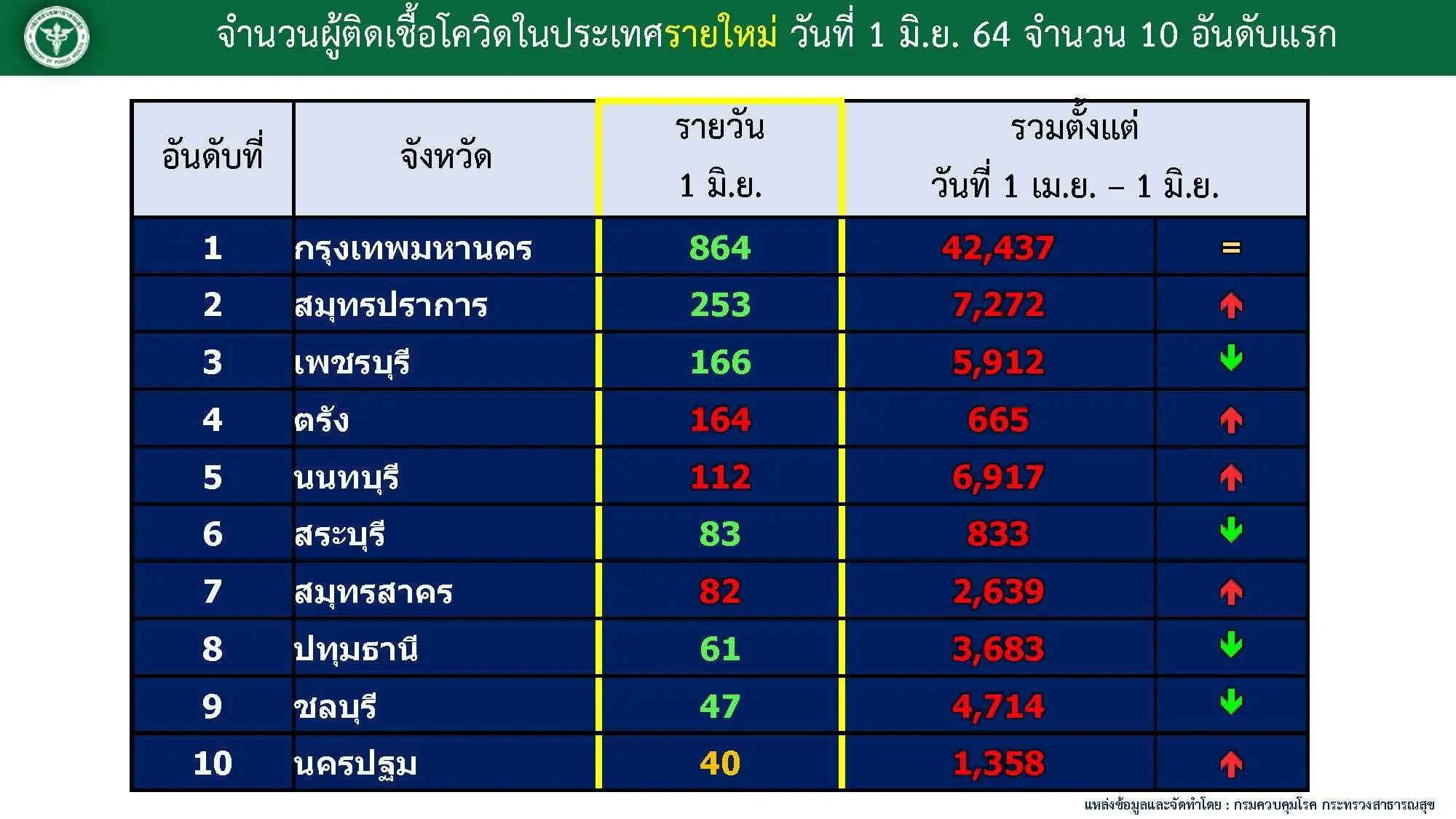 ศูนย์ข้อมูล COVID-19 เผยอันดับ 10 จังหวัดยอดโควิดสูงสุด วันที่ 1 มิ.ย. 64 กรุงเทพยังครองอันดับ 1 ผู้ติดเชื้อสูงสุดประจำวัน