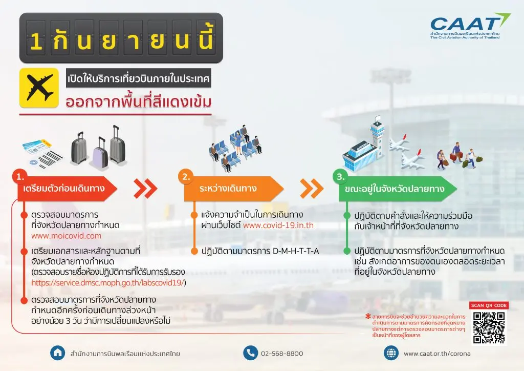 ทั้งนี้ทางด้านของเว็บไซต์ สำนักงานการบินพลเรือนแห่งประเทศไทย ได้ประกาศขั้นตอนการเตรียมตัว สำหรับการเกิดทางเที่ยวบินภายในประเทศ ออกจากพื้นที่สีแดงเข้ม ในวันที่ 1 กันยายน 2564 เป็นต้นไป โดยมีรายละเอียดดังต่อไปนี้