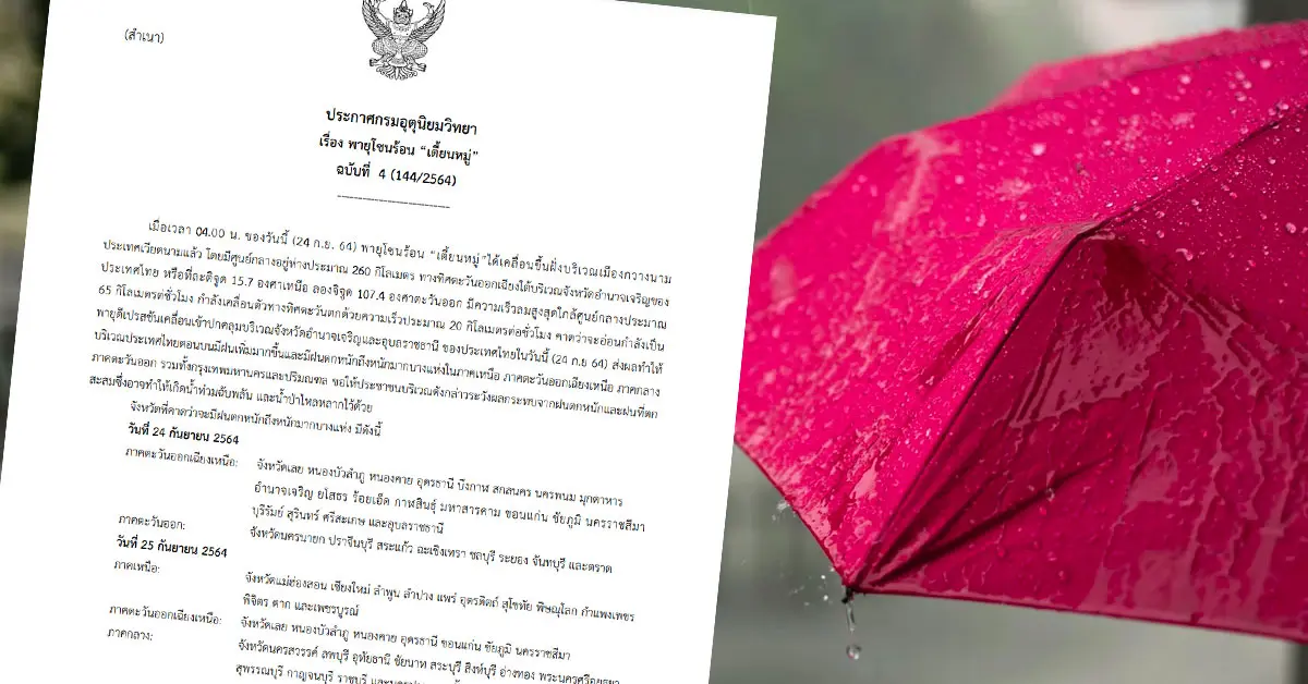 คาดว่าจะอ่อนกำลังเป็นพายุดีเปรสชันเคลื่อนเข้าปกคลุมบริเวณจังหวัดอำนาจเจริญและอุบลราชธานี ของประเทศไทยในวันนี้ (24 ก.ย 64) ส่งผลทำให้บริเวณประเทศไทยตอนบนมีฝนเพิ่มมากขึ้นและมีฝนตกหนักถึงหนักมากบางแห่งในภาคเหนือ ภาคตะวันออกเฉียงเหนือ ภาคกลาง ภาคตะวันออก รวมทั้งกรุงเทพมหานครและปริมณฑล ขอให้ประชาชนบริเวณดังกล่าวระวังผลกระทบจากฝนตกหนักและฝนที่ตกสะสมซึ่งอาจทำให้เกิดน้ำท่วมฉับพลัน และน้ำป่าไหลหลากไว้ด้วย