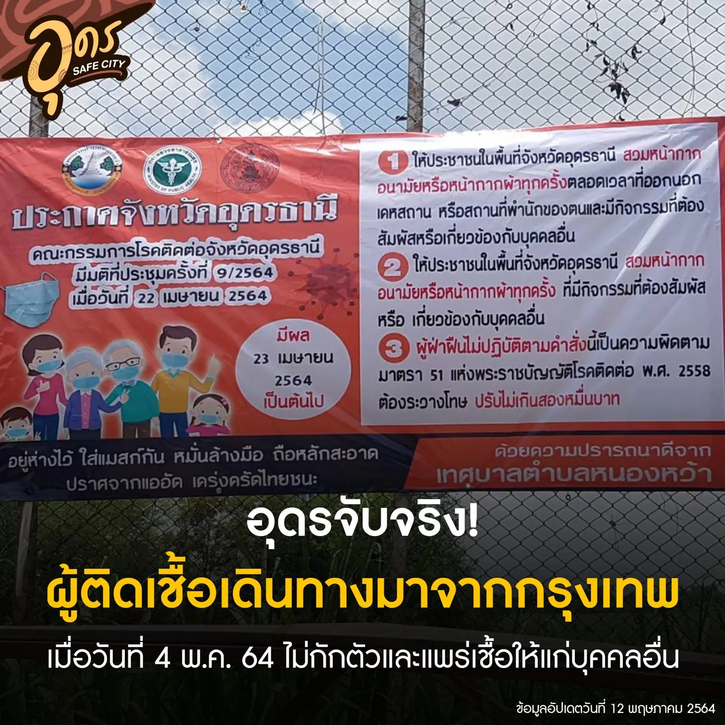 ด้านสำนักงานสาธารณสุขจังหวัดอุดรธานี เอาจริงจับจริงกับมาตรการป้องกันการแพร่เชื้อ หากผู้ที่เดินทางมาจากกรุงเทพมหานคร แต่ไม่กักตัว อีกทั้งเข้าร่วมกิจกรรม เสี่ยงต่อแพร่เชื้อจะดำเนินคดีตามกฎหมาย ทั้งนี้มีตัวอย่างจากผู้ติดเชื้อรายที่ 388 เดินทางจากกรุงเทพเข้าอุดรธานี แบบไม่กักตัว เมื่อออกจากโรงพยาบาลแล้ว เจ้าหน้าที่จึงจะดำเนินคดีต่อไป