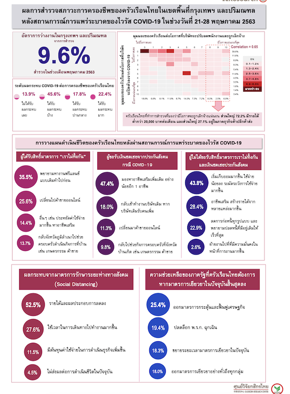 มาตรการรักษาระยะห่างทางสังคม (Social Distancing) ส่งผลกระทบต่อภาวะเศรษฐกิจของครัวเรือนไทยส่วนใหญ่ จากผลสำรวจ พบว่า แม้ในปัจจุบันจะมีการผ่อนปรนให้ธุรกิจส่วนใหญ่กลับมาดำเนินการตามปกติแล้ว แต่ครัวเรือนส่วนใหญ่ 95.5% กลับได้รับผลกระทบจากมาตรการรักษาระยะห่างทางสังคมในลักษณะที่แตกต่างกัน โดย 52.5% มีรายได้และผลประกอบการลดลง ทั้งนี้ ครัวเรือนส่วนใหญ่ 25.4% อยากให้รัฐบาลเร่งออกมาตรการกระตุ้นและฟื้นฟูเศรษฐกิจ หลังจากที่มาตรการเยียวยาในช่วงก่อนหน้าสิ้นสุดลง