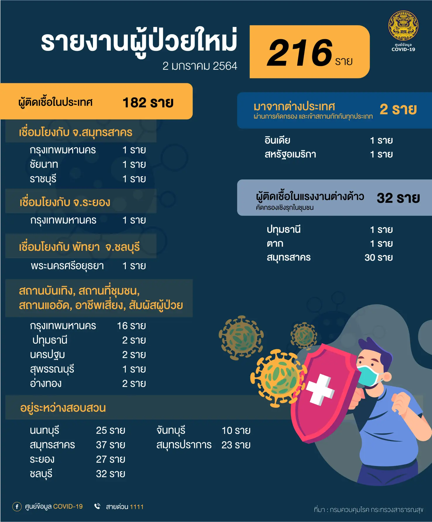 โดยผู้ป่วยรายใหม่ ติดเชื้อในประเทศ 182 ราย , แรงงานต่างชาติ 32 ราย และผู้เดินทางจากต่างประเทศอยู่สถานที่กักกันรัฐจัดให้ 2 ราย (อินเดีย 1 ราย , สหรัฐอเมริกา 1 ราย)