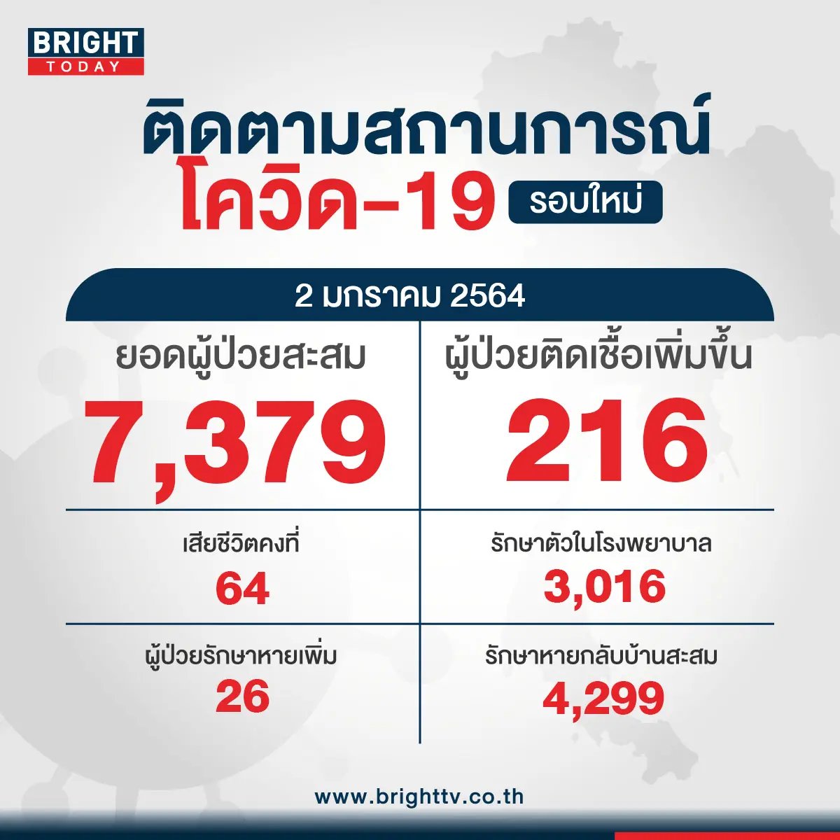 ผู้ป่วยรายใหม่ 216 ราย , ผู้ป่วยยืนยันสะสม 7,379 ราย , หายป่วยแล้ว 4,299 ราย และเสียชีวิตเพิ่ม 1 ราย รวมสะสม 64 ราย