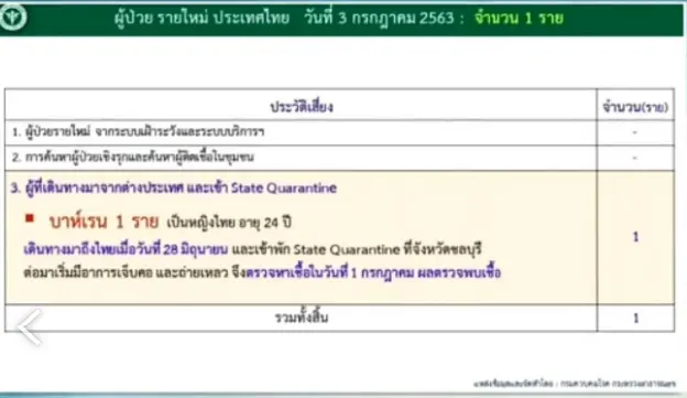 ขณะที่ผู้ป่วยใหม่ 1 ราย เดินทางมาจากต่างประเทศ บาห์เรนและเข้า State Quarantine เป็นหญิงไทย อายุ 24 ปี
