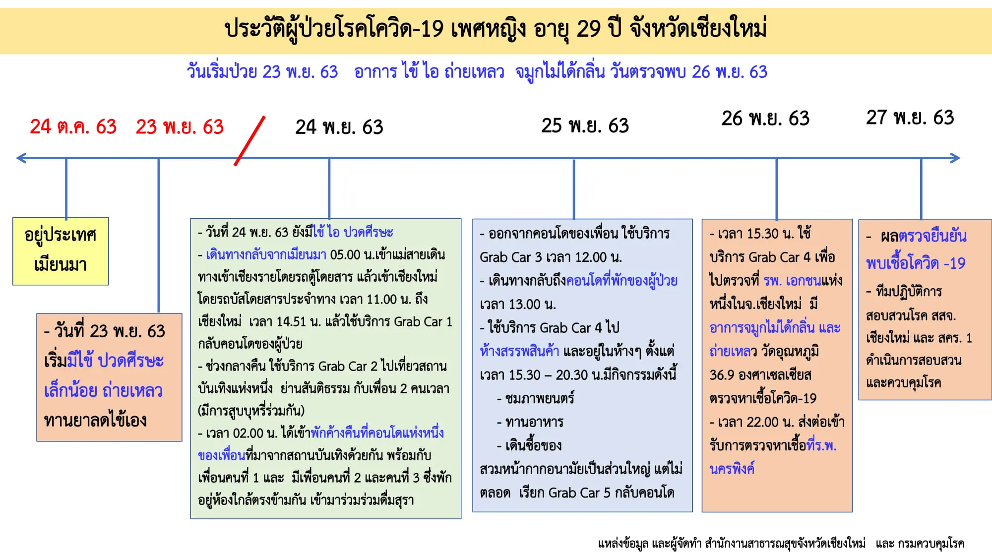 จากกรณีดังกล่าว กรมควบคุมโรค กระทรวงสาธารณสุข ได้แถลงความคืบหน้าในวันที่ 28 พ.ย.63 ผู้ป่วยหญิงรายนี้ ทราบข้อมูลไปสถานเที่ยวและห้างสรรพสินค้า โดยมีการสวมหน้ากากอนามัย เป็นบางช่วง รวมถึงยังมีข้อมูลพบว่ามีการสูบบุหรี่ มวนเดียวกันกับกลุ่มเพื่อนที่เที่ยวด้วยกัน