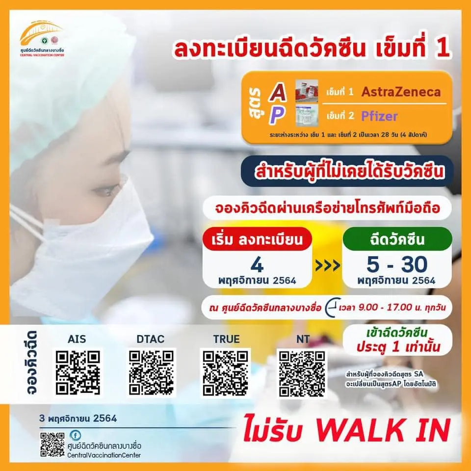 สำหรับผู้ที่ไม่เคยรับวัคซีนป้องกันโรคโควิด19มีอายุตั้งแต่ 18 ปี โดยลงทะเบียนผ่านเครือข่ายโทรศัพท์มือถือ ฉีดวัคซีน วันที่ 5-30 พฤศจิกายน 2564 ณ ศูนย์ฉีดวัคซีนกลางบางซื่อ เข้ารับบริการที่ ประตู 1 เวลา 9.00 – 17.00 น. ทุกวัน ฟรี ไม่มีค่าใช้จ่าย