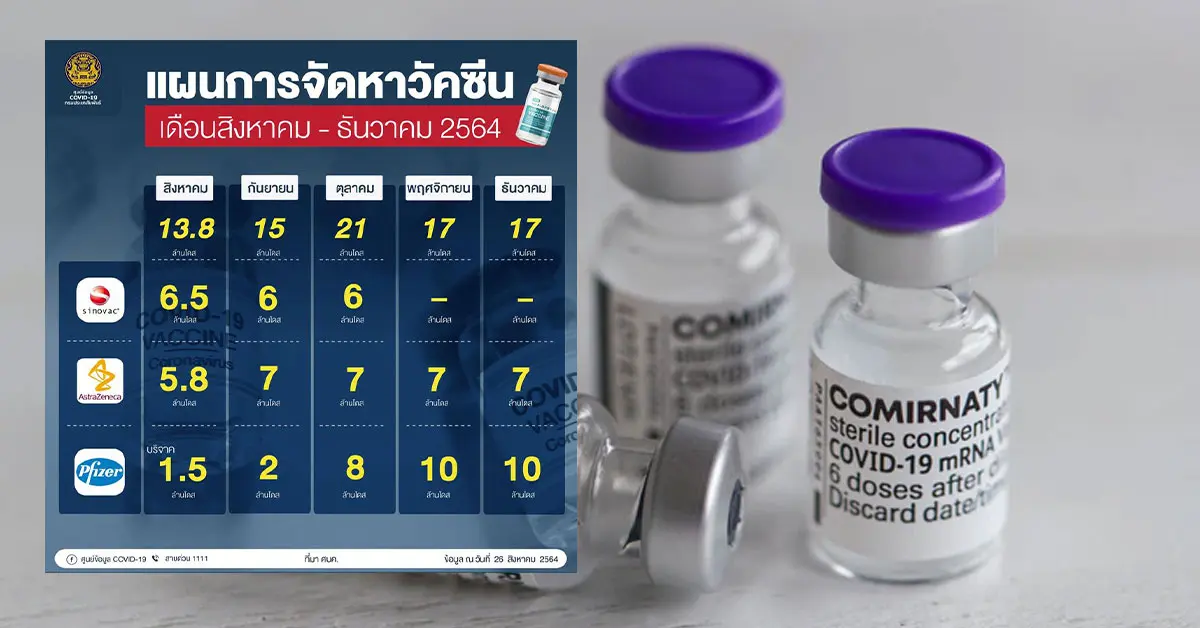 เมื่อวันที่ 26 สิงหาคม 2564 ทางเพจเฟซบุ๊ก ศูนย์ข้อมูล COVID-19 ได้เปิดเผยแผนการจัดหาวัคซีนโควิด-19 ในครั้งปีหลัง นับตั้งแต่เดือนสิงหาคม จนถึงเดือนธันวาคม 2564 ซึ่งเป็นการจัดหาวัคซีนทั้งหมด 3 ยี่ห้อที่ขณะนี้กำลังดำเนินการจัดสรรให้กับประชาชนในประเทศ นั้นคือ วัคซีนซิโนแวค และวัคซีนแอสตร้าเซนเนก้า ซึ่งเป็นวัคซีนหลักในประเทศ โดยใช้สูตร เข็มแรกวัคซีนซิโนแวค ตามด้วนแอสตร้าเซนเนก้า เป็นเข็มที่ 2 และอีกหนึ่งยี่ห้อคือ วัคซีนไฟเซอร์ ที่ขณะนี้ใช้เป็นวัคซีนเข็มที่ 3 บูสเตอร์ให้กับกลุ่มบุคลากรหน้าด่าน และใช้ฉีดในกลุ่มเป้าหมายบางกรณี