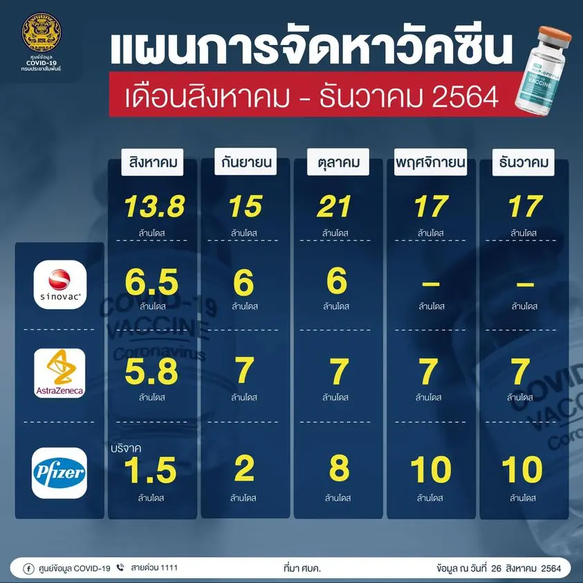 - เดือนสิงหาคม 2564 จัดหาวัคซีนทั้งหมด 13.8 ล้านโดส