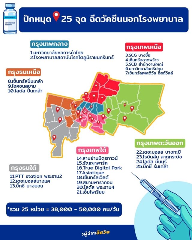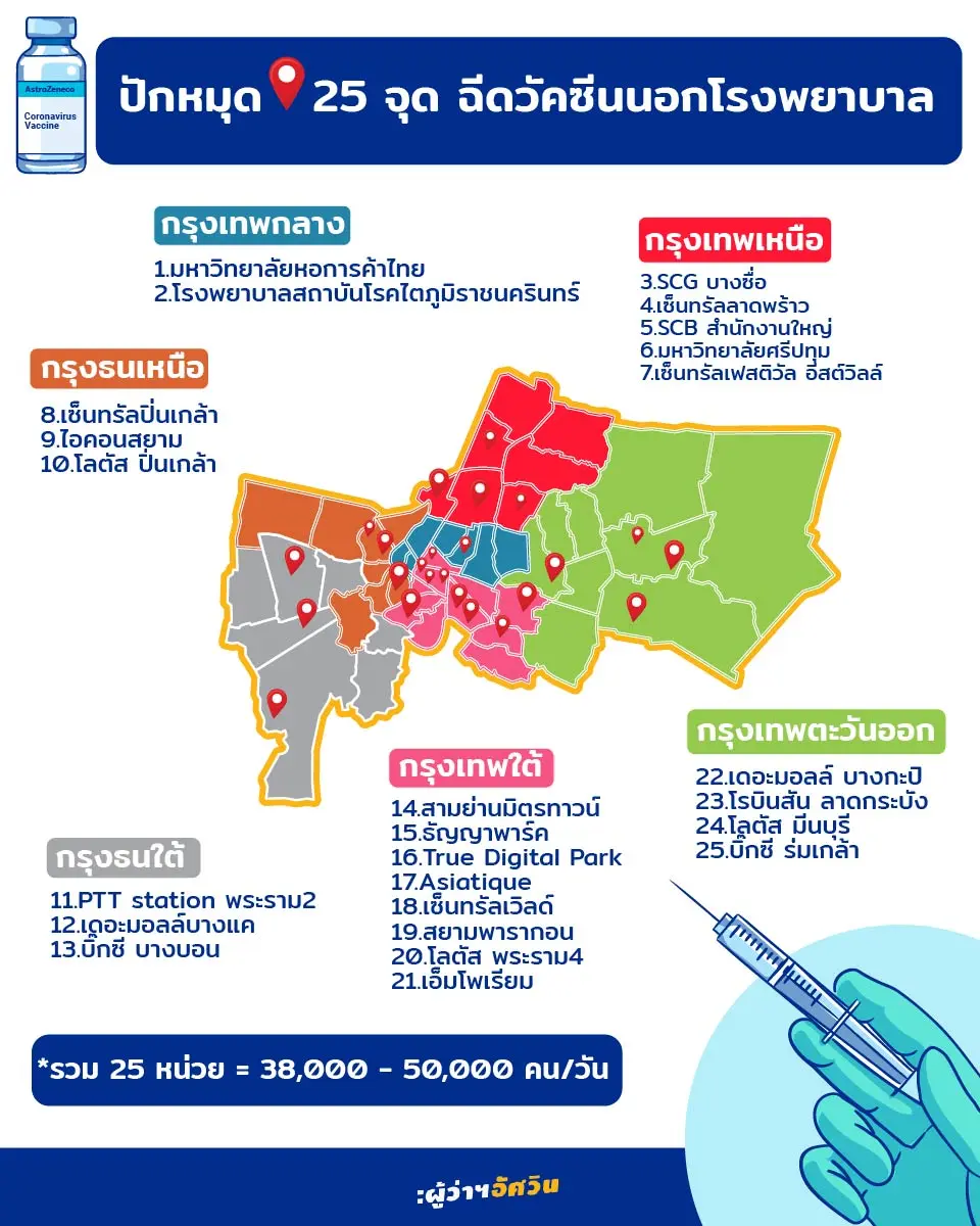 โดยจุดฉีดวัคซีนนอกโรงพยาบาลมีทั้งหมด 25 จุดดังนี้