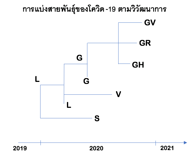 ไวรัสก่อโรคโควิด-19 เริ่มต้นจากประเทศจีนจะมี 2 สายพันธุ์ คือ สายพันธุ์ S (Serine) และสายพันธุ์ L (Leucine) และเมื่อระบาดมาสู่นอกประเทศจีน สายพันธุ์ L แพร่กระจายได้ดีกว่าและแบ่งลูกหลานออกเป็นสายพันธุ์ G (Glycine) และสายพันธุ์ V (Valine)