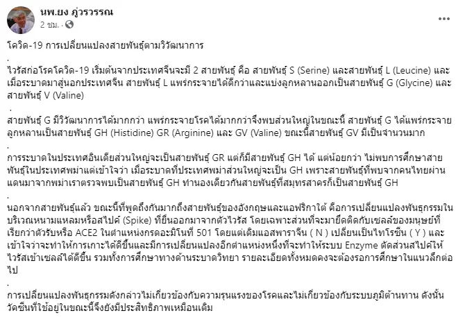 ล่าสุดวันนี้ (25ธ.ค.63) นายแพทย์ยง ภู่วรวรรณ ได้ออกมาโพสต์ข้อความผ่าน เฟซบุ๊กส่วนตัว เกี่ยวกับการกลายพันธุ์ของเชื้อโควิด-19 โดยระบุข้อความว่า