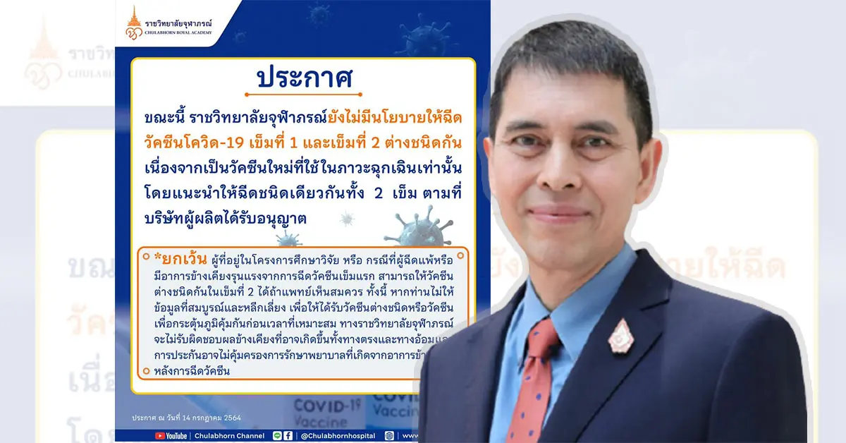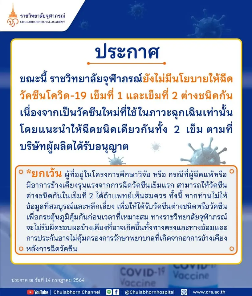 หมอนิธิ เคลื่อนไหว เมื่อเช้าที่ผ่านมา โพสต์ยืนยัน ราชวิทยาลัยจุฬาภรณ์ ไม่มีนโยบาบ ฉีดวัคซีนต่างชนิด ฉีด 2 เข็มชนิดเดียวกันตามคำแนะนำของผู้ผลิต