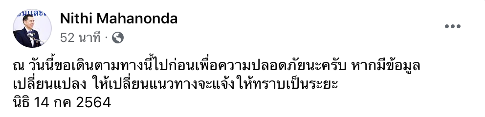 ” ณ วันนี้ขอเดินตามทางนี้ไปก่อนเพื่อความปลอดภัยนะครับ หากมีข้อมูลเปลี่ยนแปลง ให้เปลี่ยนแนวทางจะแจ้งให้ทราบเป็นระยะนิธิ 14 กค 2564 “