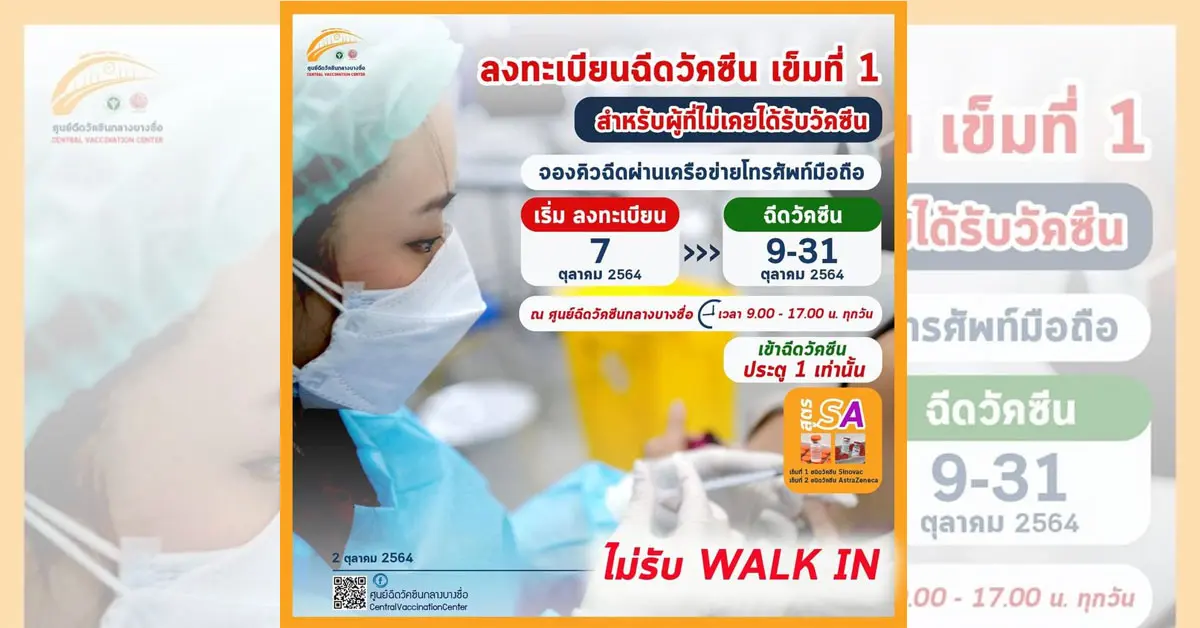 ห้ามพลาด! สถานีกลางบางซื่อ เปิดลงทะเบียนวัคซีน เข็ม1 สูตรไขว้ ฟรี! 7ต.ค.นี้ ไม่มีwalk in ผ่านเครือข่ายมือถือ ได้ฉีดวัคซีนในวันที่ 9-31 ตุลาคม 2564