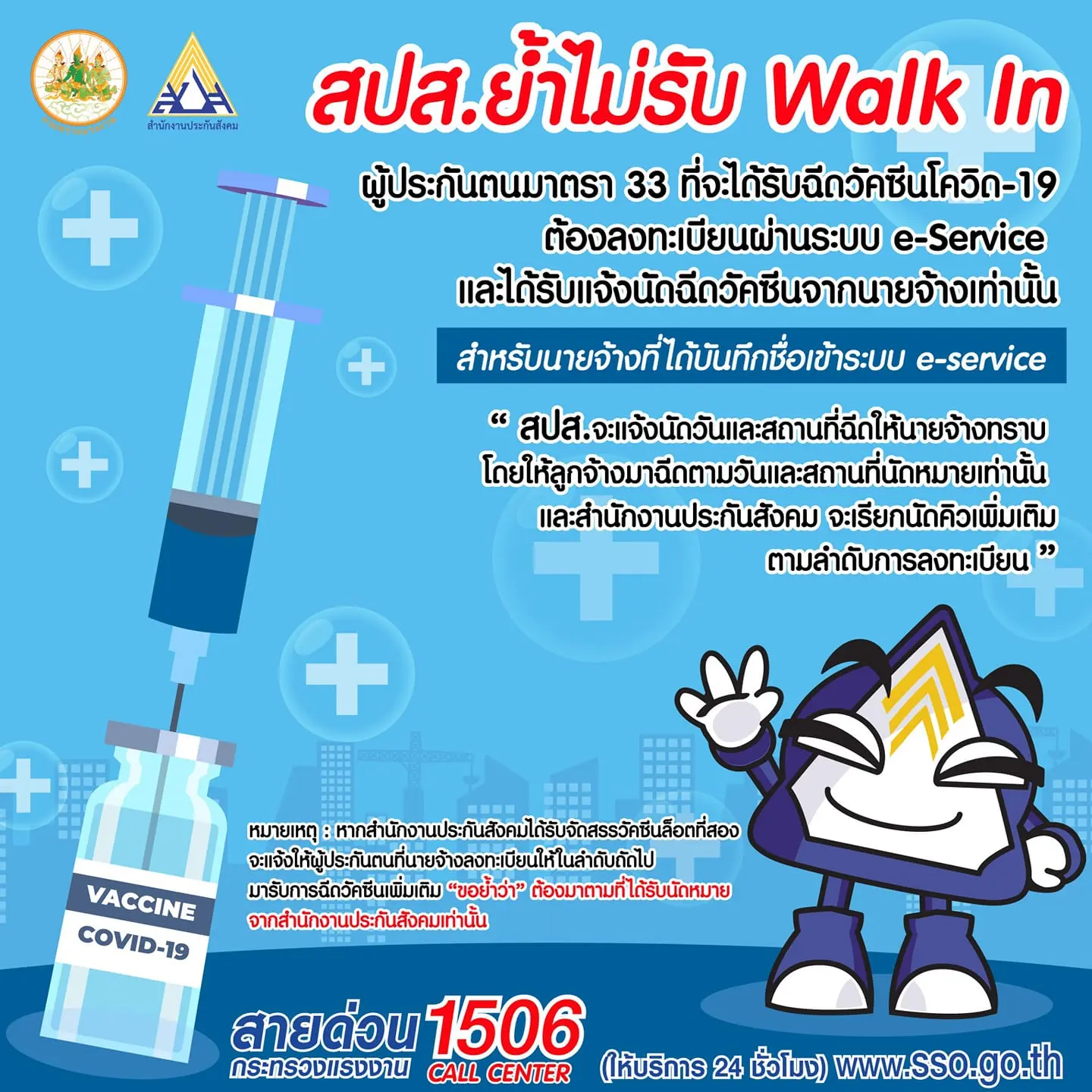 โดยที่ผ่านมายังมีคนที่โทรเข้ามาสอบถามเกี่ยวกับการฉีดวัคซีนในกลุ่มผู้ประกันตน ตามมาตรา33 ซึ่งเป็นกลุ่มที่ไม่ได้ลงทะเบียนไว้ก่อนหน้านี้ หรือ ลงทะเบียนไว้แต่ยังไม่ถึงกำหนดนัด ได้ walk in มาที่ศูนย์เพื่อขอรับบริการฉีดวัคซีน สำนักงานประกันสังคม ขอแจ้งให้ทราบว่า จะบริการฉีดวัคซีนสำหรับคนที่ลงทะเบียนผ่านทางระบบ e-service ของสำนักงานประกันสังคม และมานามนัดหมาย เท่านั้น ไม่รับบริการฉีดวัคซีนให้กับผู้ที่ไม่ได้ลงทะเบียน หรือ walk in เข้ามาที่ศูนย์บริการ