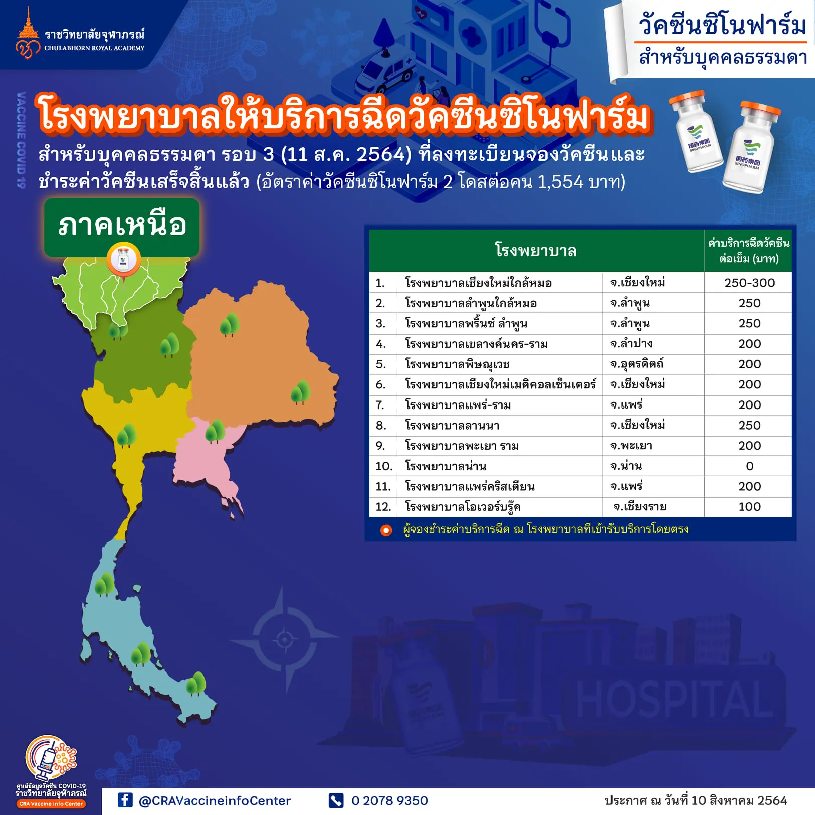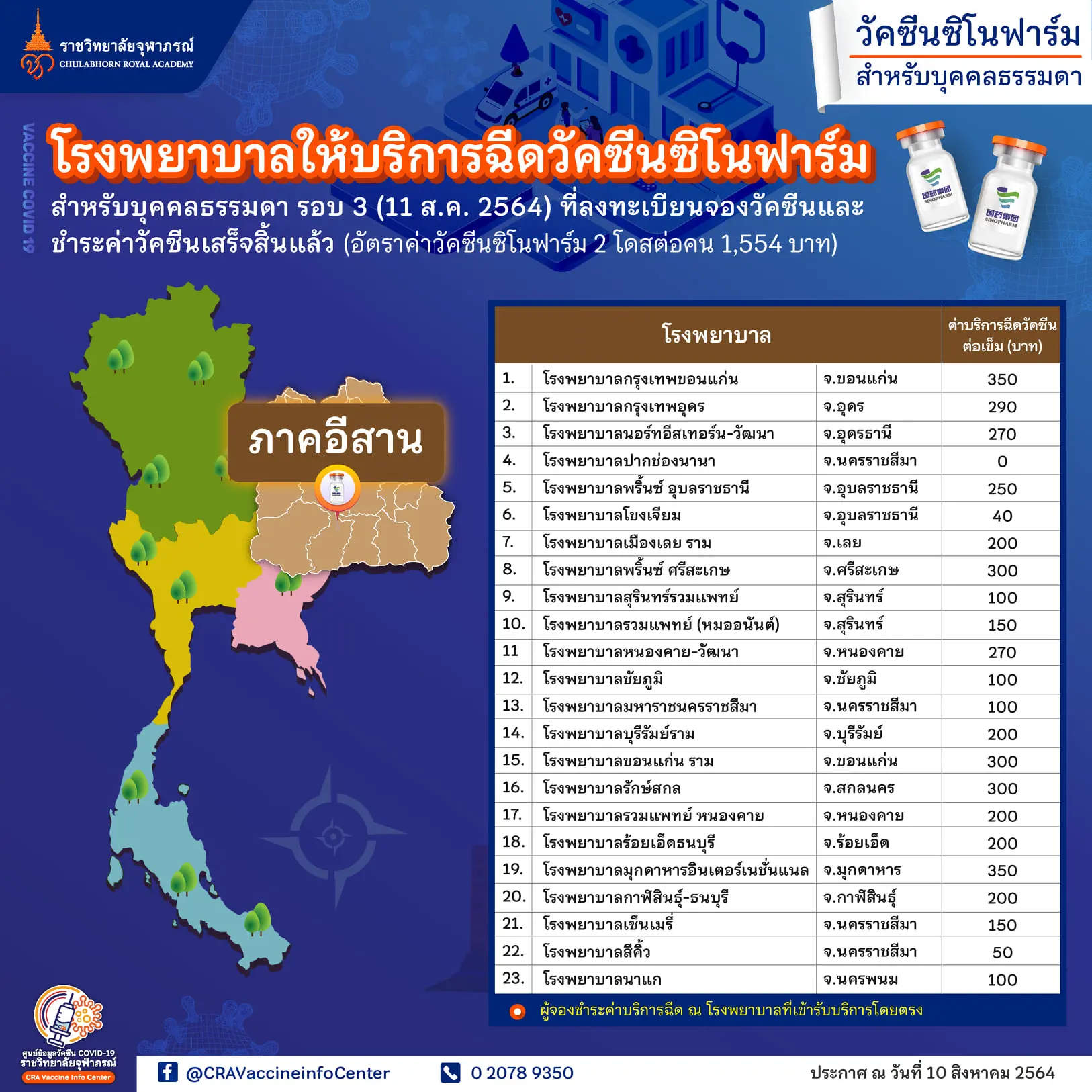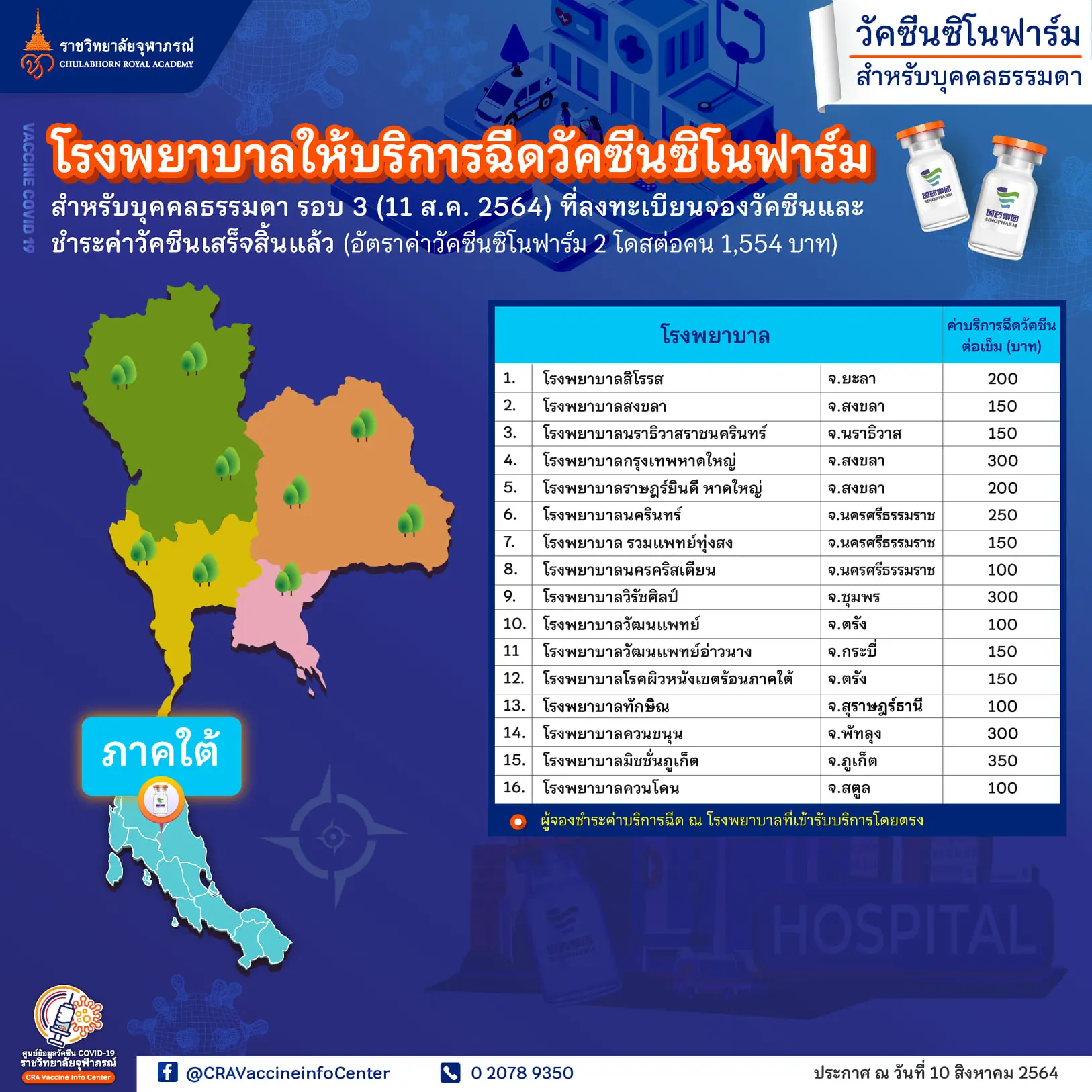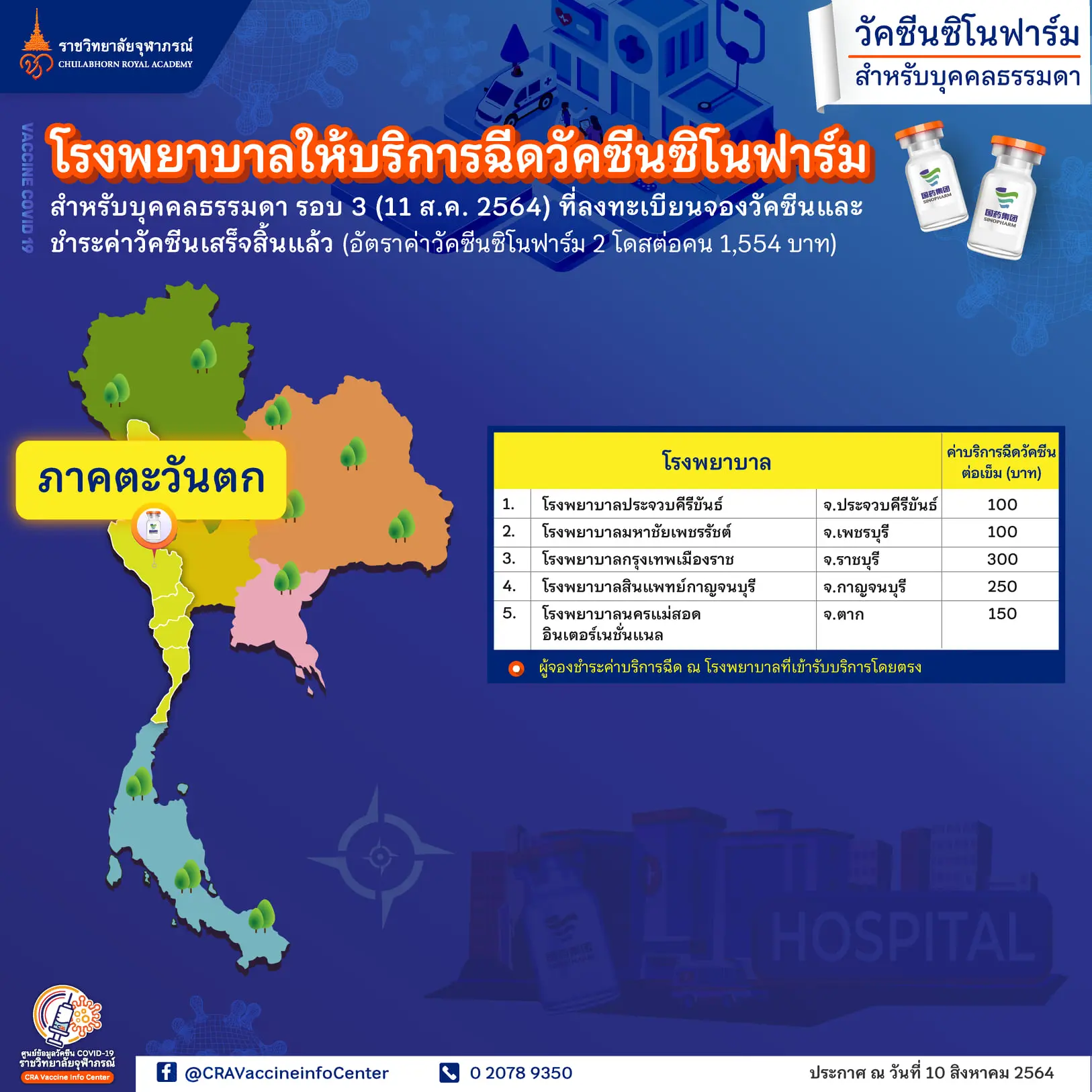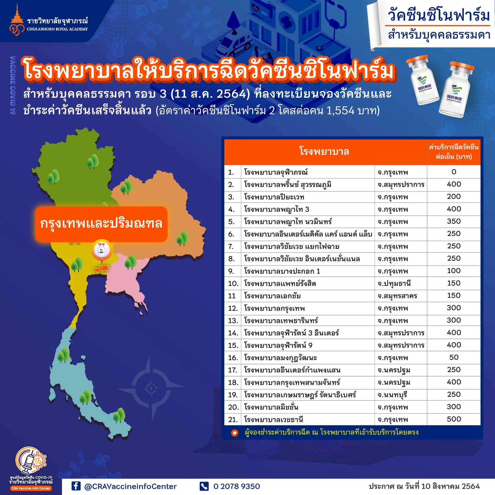 โดยก่อนการเปิดจองวัคซีนซิโนฟาร์ม ในรอบที่ 3 ทางเพจเฟซบุ๊ก โรงพยาบาลจุฬาภรณ์ ราชวิทยาลัยจุฬาภรณ์ ประกาศรายชื่อโรงพยาบาลที่เข้าร่วมให้บริการฉีดวัคซีน“ซิโนฟาร์ม”สำหรับบุคคลธรรมดา รอบที่ 3 (วันที่ 11 สิงหาคม 2564) ภายหลังจากท่านลงทะเบียนสำเร็จ ท่านสามารถเข้าจองวัคซีนได้ในเวลา 14.00 น. โดยเลือกวันเข้าฉีดวัคซีนซิโนฟาร์มกับโรงพยาบาลที่เข้าร่วมให้บริการ ระหว่างวันที่ 23 สิงหาคม – 5 กันยายน 2564