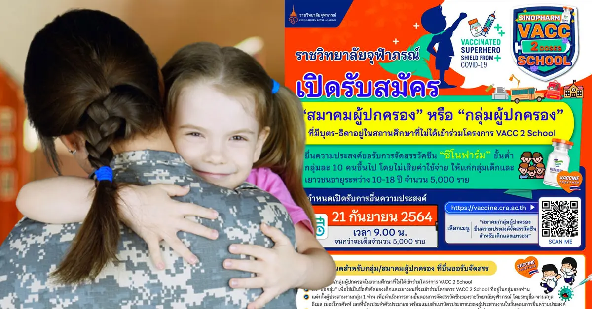 ล่าสุดทางราชวิทยาลัยจุฬาภรณ์ ยังเปิดรับสมัคร “สมาคมผู้ปกครอง” หรือ “กลุ่มผู้ปกครอง” ที่มีบุตร-ธิดาอยู่ในสถานศึกษาที่ไม่ได้เข้าร่วมโครงการ VACC 2 School ยื่นความประสงค์ขอรับการจัดสรรวัคซีน “ซิโนฟาร์ม” ขั้นต่ำกลุ่มละ 10 คนขึ้นไป โดยไม่เสียค่าใช้จ่าย ให้แก่กลุ่มเด็กและเยาวชนอายุระหว่าง 10-18 ปี จำนวน 5,000 ราย