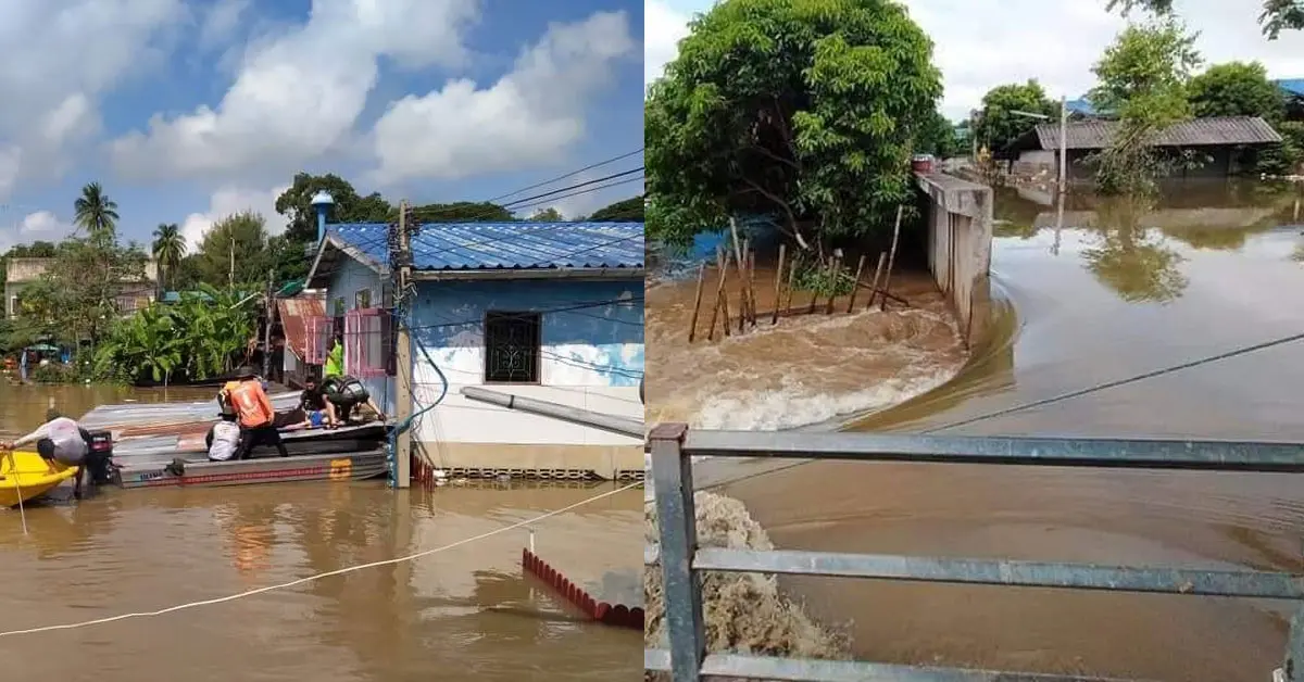รั้งต่อไม่ไหว! พนังกั้นน้ำ ริมแม่น้ำเจ้าพระยา หน้าวัดปราสาทอินทร์บุรี ในจังวัด สิงห์บุรี “ขาด” เสียหาย 60-80 หลังคาเรือน เบื้องต้นอพยพประชาชนออกจากพื้นที่